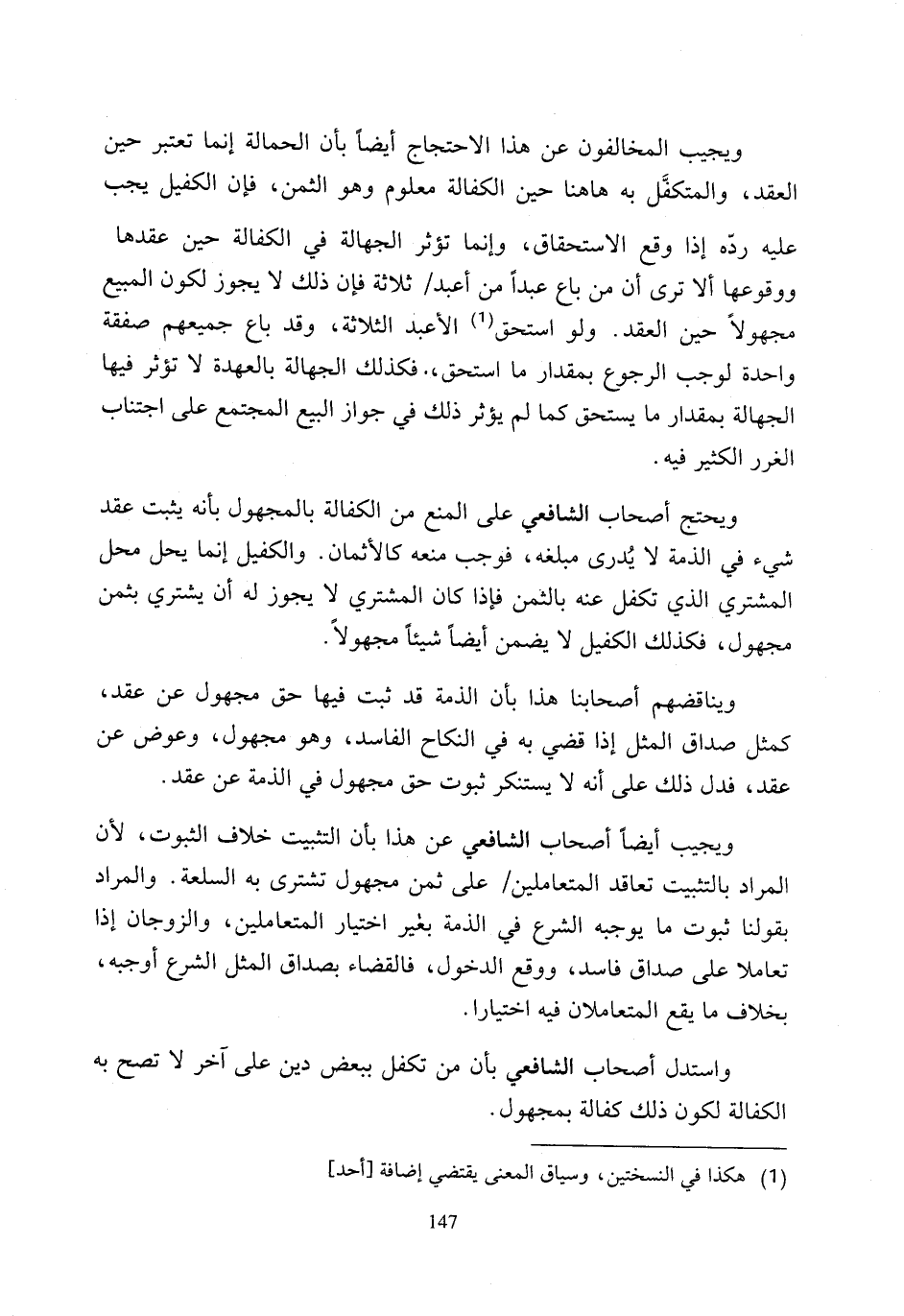 ويجيب المخالفون عن هذا الاحتجاج أيضًا بأن الحمالة إنما تعتبر حين العقد، والمتكفَّل به ها هنا حين الكفالة معلوم وهو الثمن، فإن الكفيل يجب عليه ردّه إذا وقع الاستحقاق، وإنما تؤثر الجهالة في الكفالة حين عقدها ووقوعها ألا ترى أن من باع عبدًا من أعبد ثلاثة فإن ذلك لا يجوز لكون المبيع مجهولًا حين العقد. ولو استحق (¬1) الأعبد الثلاثة، وقد باع جميعهم صفقة واحدة لوجب الرجوع بمقدار ما استحق،. فكذلك الجهالة بالعهدة لا تؤثر فيها الجهالة بمقدار ما يستحق كما لم يؤثر ذلك في جواز البيع المجتمع على اجتناب الغرر الكثير فيه.