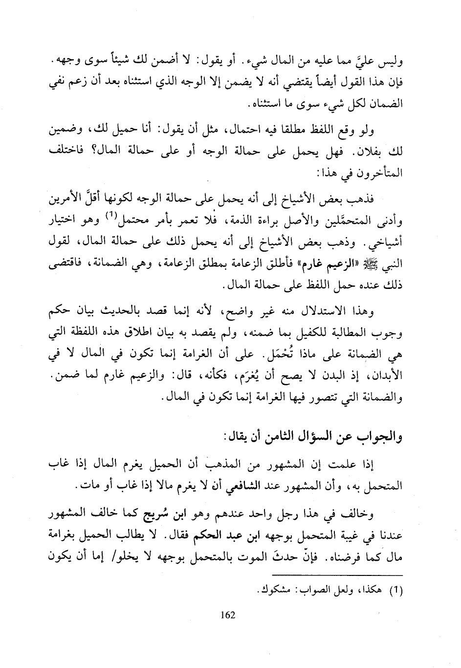 وخالف في هذا رجل واحد عندهم وهو ابن سُريج كما خالف المشهور عندنا في غيبة المتحمل بوجهه ابن عبد الحكم فقال. لا يطالب الحميل بغرامة مال كما فرضناه. فإنّ حدثَ الموت بالمتحمل بوجهه لا يخلو إما أن يكون