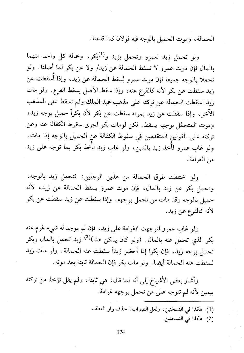 ولو تحمل زيد لعمرو وتحمل يزيد و (¬1) بكر، وحمالة كل واحد منهما بالمال فإن موت عمرو لا تسقط الحمالة عن زيدل ولا عن بكر لما أصلنا. ولو تحملا بالوجه جميعًا فإن موت عمرو يُسقط الحمالة عن زيد، وإذا أُسقطت عن زيد سقطت عن بكر لأنه كالفرع عنه، وإذا سقط الأصل يسقط الفرع. ولو مات زيد لسقطت الحمالة عن تركته على مذهب عبد الملك ولم تسقط على المذهب الآخر، وإذا سقطت عن زيد بموته سقطت عن بكر لأن بكرًا حميل بوجه زيد، وموت المتحمَّل بوجهه يسقط. لكن لومات بكر لجرى سقوط الكفالة عنه وعن تركته على القولين المتقدمين في سقوط الكفالة عين الحميل بالوجه إذا مات.