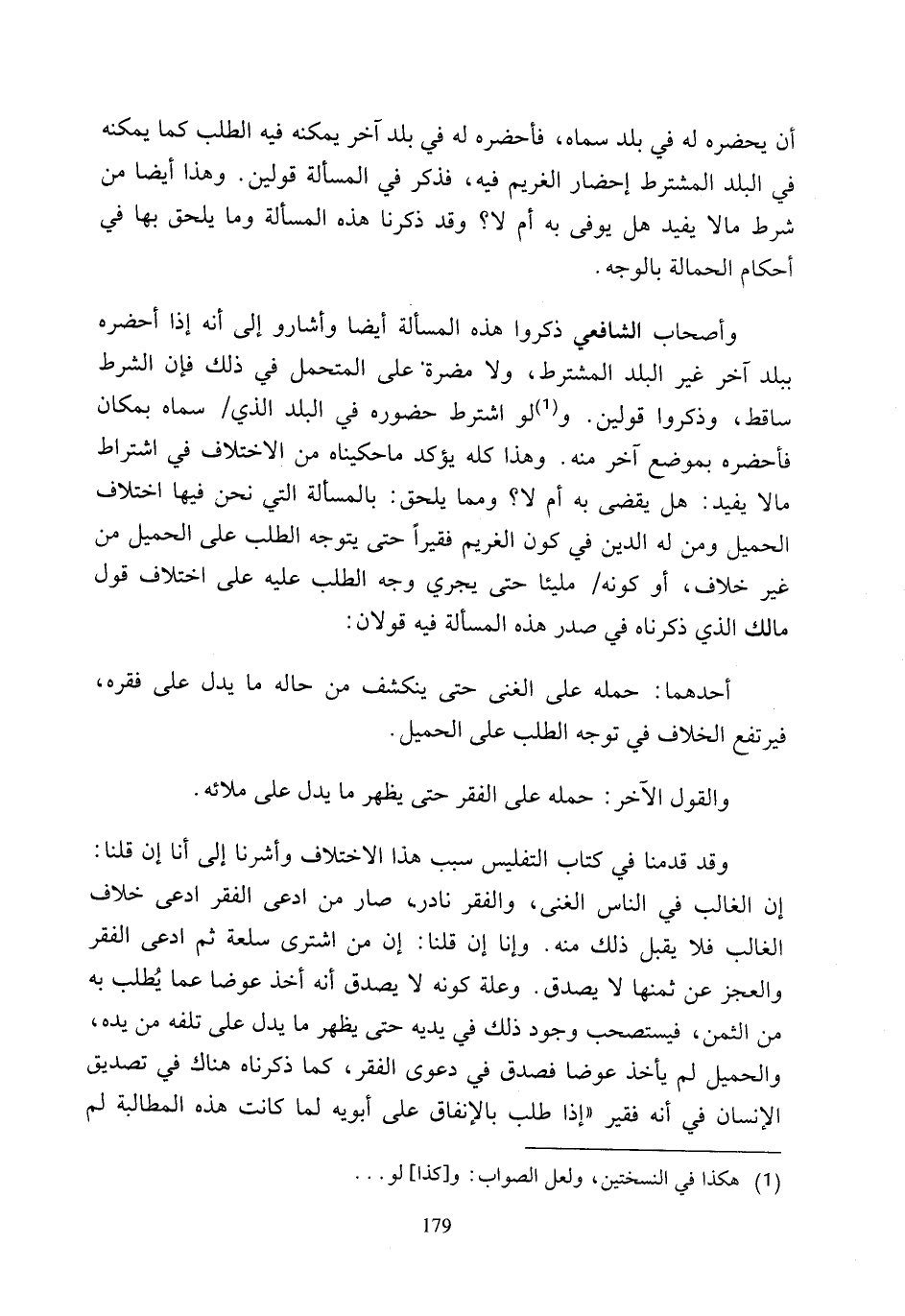 وأصحاب الشافعي ذكروا هذه المسألة أيضًا وأشارو إلى أنه إذا أحضره ببلد آخر غير البلد المشترط، ولا مضرة على المتحمل في ذلك فإن الشرط ساقط، وذكروا قولين. و (¬1) لو اشترط حضوره في البلد الذي سماه بمكان فأحضره بموضع آخر منه. وهذا كله يؤكد ما حكيناه من الاختلاف في اشتراط مالًا يفيد: هل يقضى به أم لا؟ ومما يلحق: بالمسألة التي نحن فيها اختلاف الحميل ومن له الدينَ في كون الغريم فقيرًا حتى يتوجه الطلب على الحميل من غير خلاف، أو كونه مليئا حتى يجري وجه الطلب عليه على اختلاف قول مالك الذي ذكرناه في صدر هذه المسألة فيه قولان: