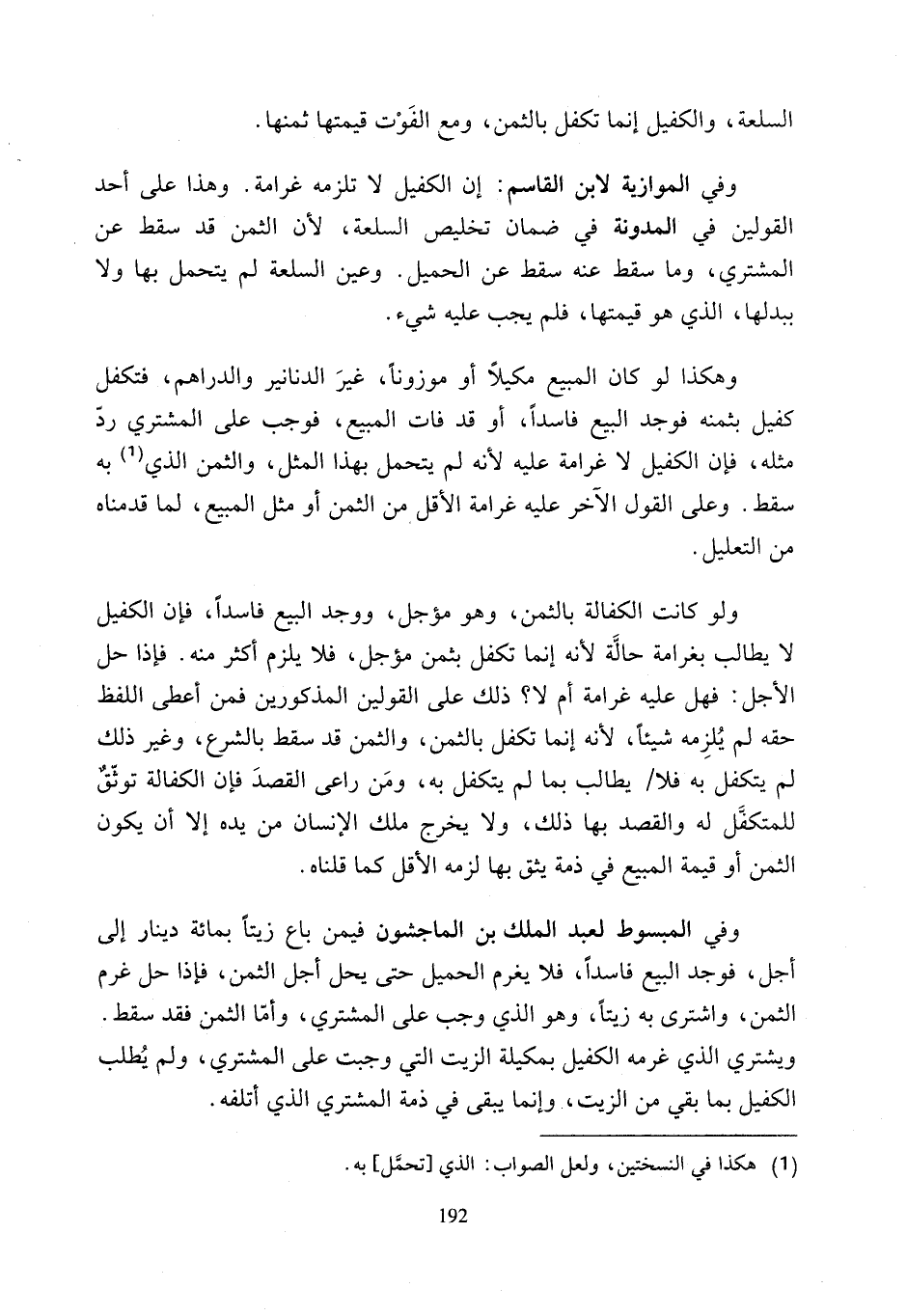 وفي المبسوط لعبد الملك بن الماجشون فيمن باع زيتًا بمائة دينار إلى أجل، فوجد البيع فاسدًا، فلا يغرم الحميل حتى يحل أجل الثمن، فإذا حل غرم الثمن، واشترى به زيتًا، وهو الذي وجب على المشتري، وأمّا الثمن فقد سقط. ويشتري الذي غرمه الكفيل بمكيلة الزيت التي وجبت على المشتري، ولم يُطلب الكفيل بما بقي من الزيت، وإنما يبقى في ذمة المشتري الذي أتلفه.
