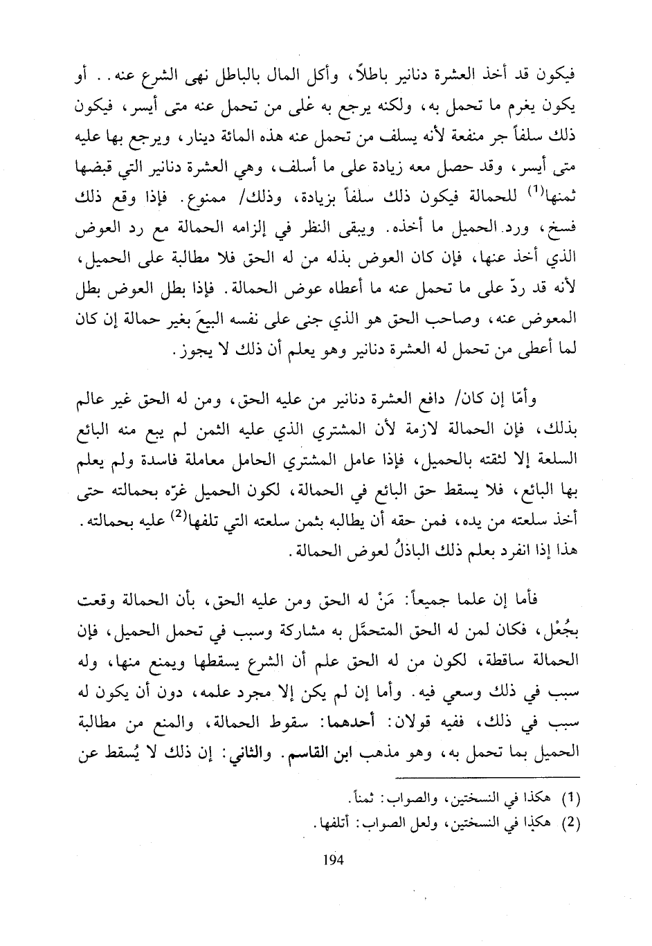 وأمّا إن كان دافع العشرة دنانير من عليه الحق، ومن له الحق غير عالم بذلك، فإن الحمالة لازمة لأن المشتري الذي عليه الثمن لم يبع منه البائع السلعة إلا لثقته بالحميل، فإذا عامل المشتري الحامل معاملة فاسدة ولم يعلم بها البائع، فلا يسقط حق البائع في الحمالة، لكون الحميك غرّه بحمالته حتى أخذ سلعته من يده، فمن حقه أن يطالبه بثمن سلعته التي تلفها (¬2) عليه بحمالته.