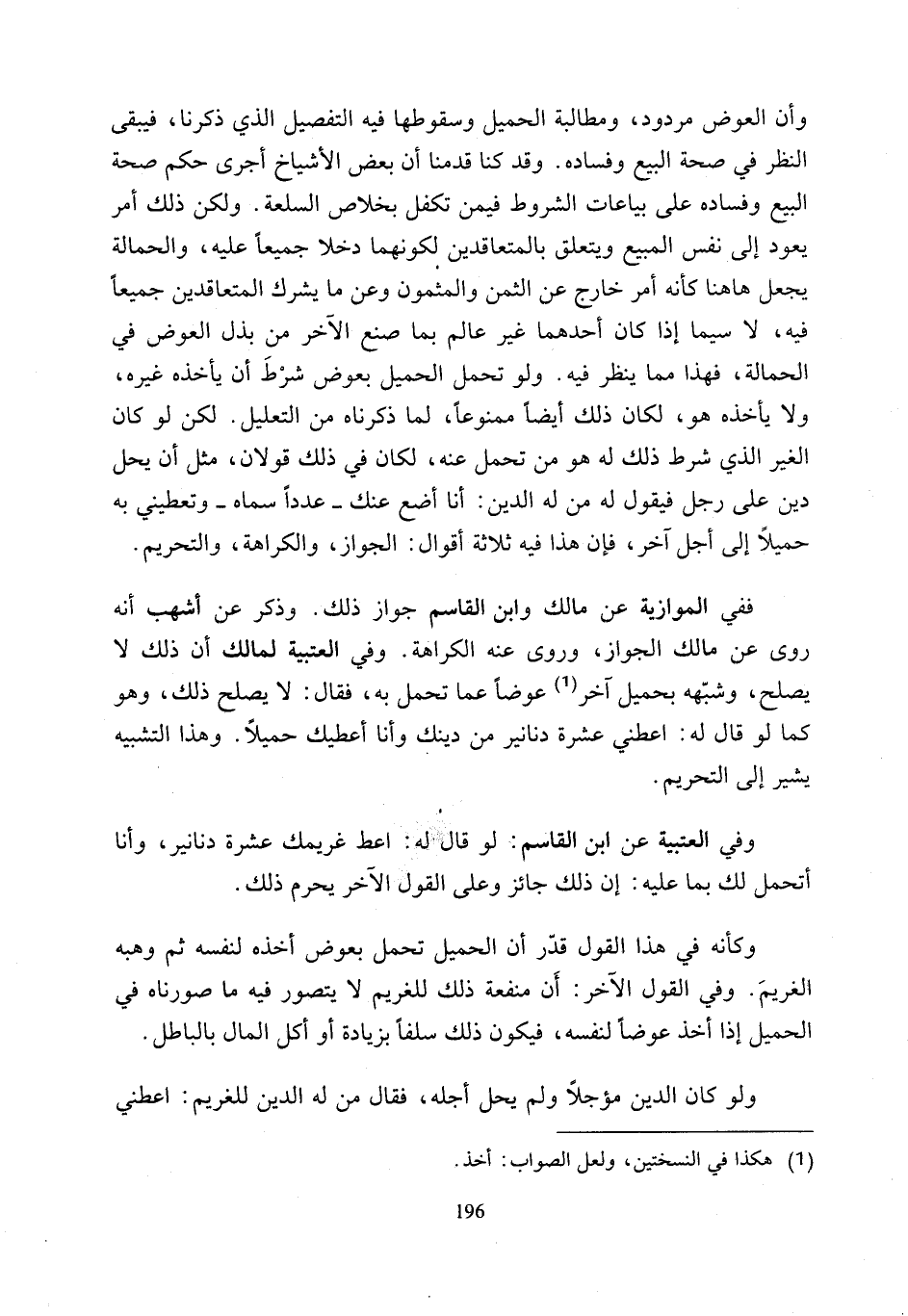 وأن العوض مردود، ومطالبة الحميل وسقوطها فيه التفصيل الذي ذكرنا، فيبقى النظر في صحة البيع وفساده. وقد كنا قدمنا أن بعض الأشياخ أجرى حكم صحة البيع وفساده على بياعات الشروط فيمن تكفل بخلاص السلعة. ولكن ذلك أمر يعود إلى نفس المبيع ويتعلق بالمتعاقدين بكونهما دخلا جميعًا عليه، والحمالة يجعل ها هنا كأنه أمر خارج عن الثمن والمثمون وعن ما يشرك المتعاقدين جميعًا فيه، لا سيما إذا كان أحدهما غير عالم بما صنع الآخر من بذل العوض في الحمالة، فهذا مما ينظر فيه. ولو تحمل الحميل بعوض شرْطَ أن يأخذه غيره،