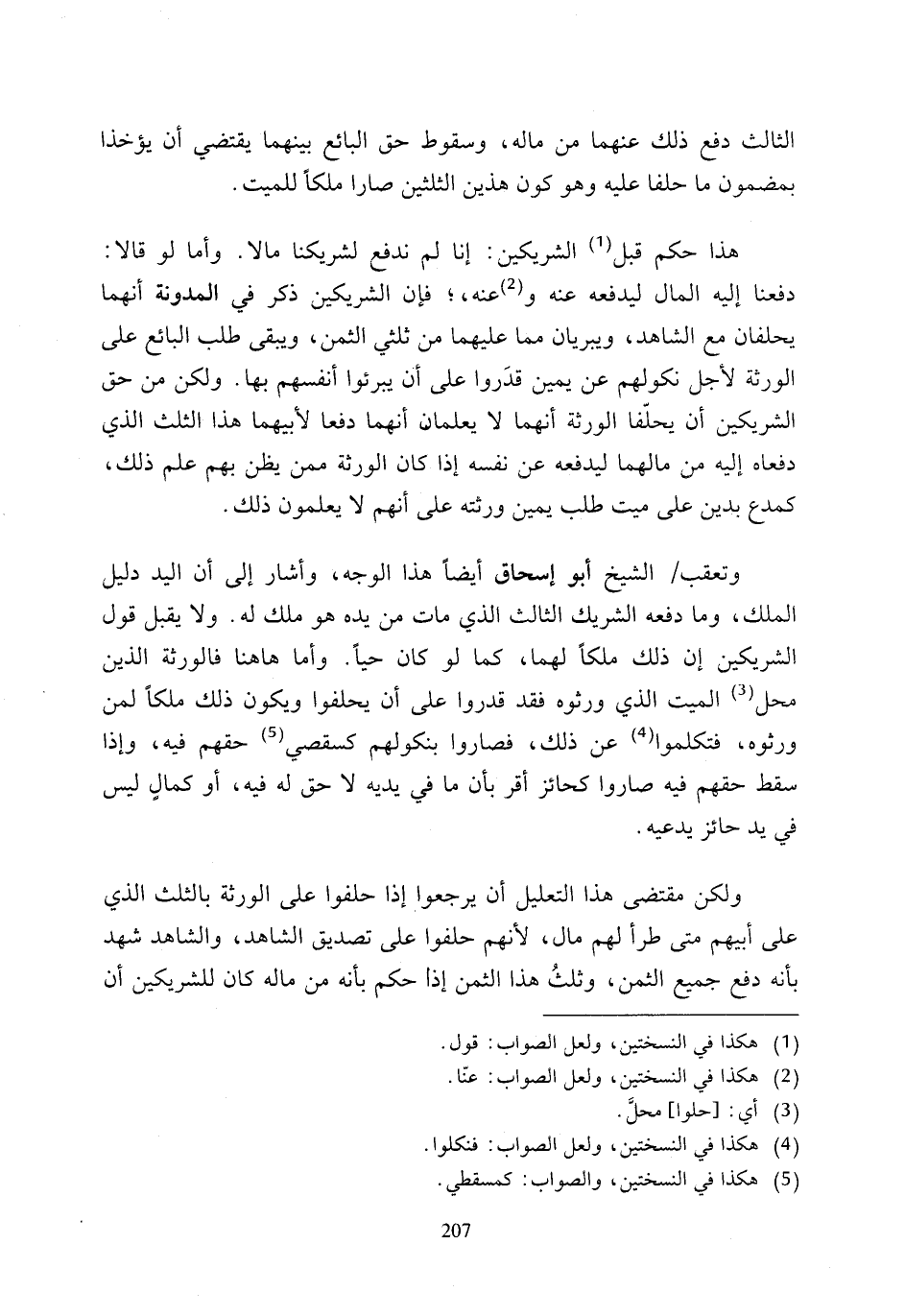 وتعقب الشيخ أبو إسحاق أيضًا هذا الوجه، وأشار إلى أن اليد دليل الملك، وما دفعه الشريك الثالث الذي مات من يده هو ملك له. ولا يقبل قول الشريكين إن ذلك ملكًا لهما، كما لو كان حيًا. وأما ها هنا فالورثة الذين محل (¬3) الميت الذي ورثوه فقد قدروا على أن يحلفوا ويكون ذلك ملكًا لمن ورثوه، فتكلموا (¬4) عن ذلك، فصاروا بنكولهم كسقصي (¬5) حقهم فيه، وإذا سقط حقهم فيه صاروا كحائز أقر بأن ما في يديه لا حق له فيه، أو كمالٍ ليس في يد حائز يدعيه.