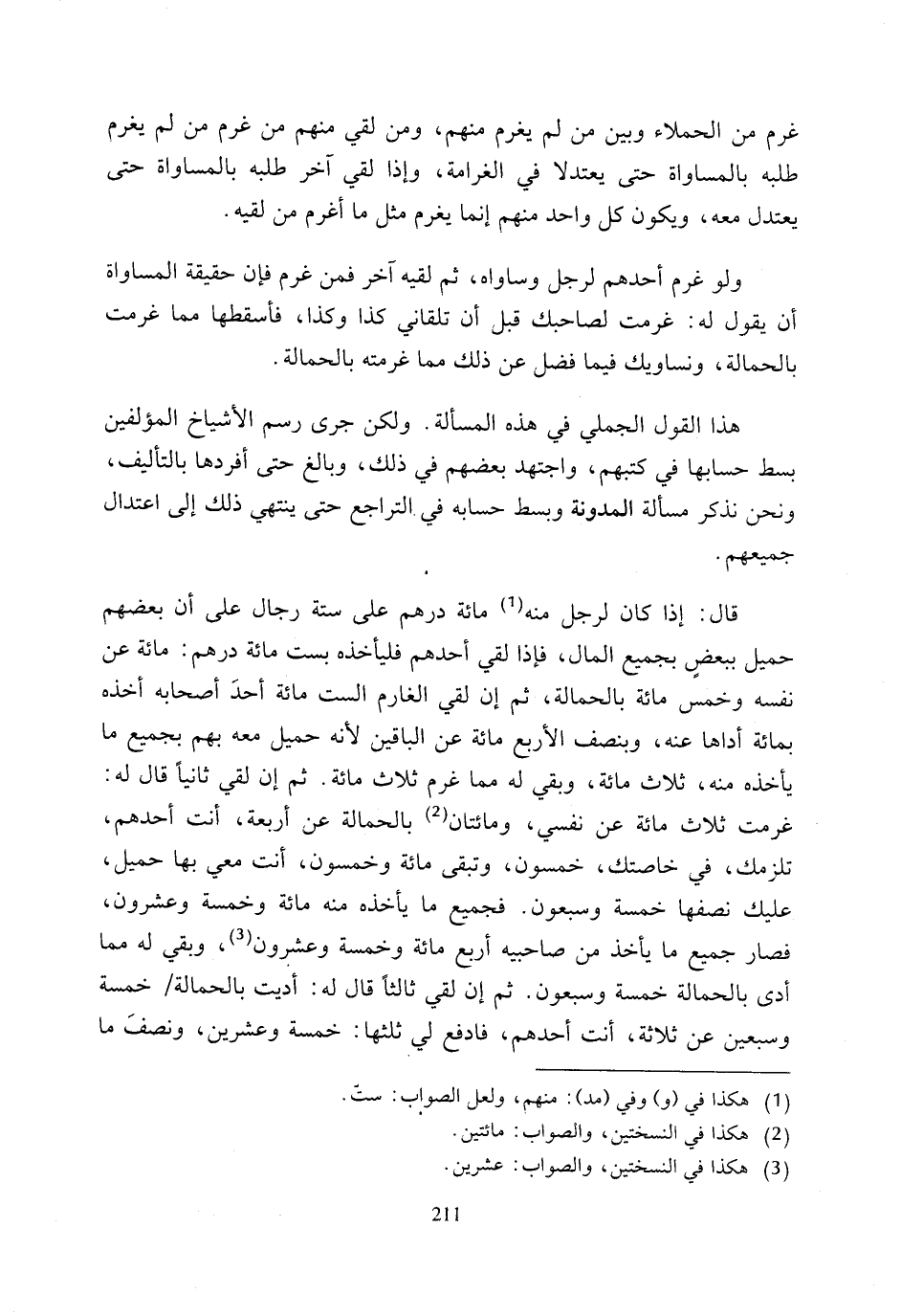 هذا القول الجملي في هذه المسألة. ولكن جرى رسم الأشياخ المؤلفين بسط حسابها في كتبهم، واجتهد بعضهم في ذلك، وبالغ حتى أفردها بالتأليف، ونحن نذكر مسألة المدونة وبسط حسابه في التراجع حتى ينتهي ذلك إلى اعتدال جميعهم.