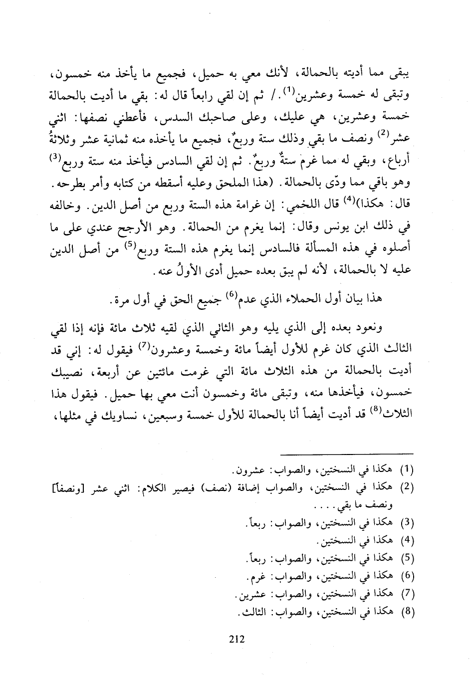 يبقى مما أديته بالحمالة، لأنك معي به حميل، فجميع ما يأخذ منه خمسون، وتبقى له خمسة وعشرين (¬1). ثم إن لقي رابعًا قال له: بقي ما أديت بالحمالة خمسة وعشرين، هي عليك، وعلى صاحبك السدس، فأعطني نصفها: اثني عشر (¬2) ونصف ما بقي وذلك ستة وربعٌ، فجميع ما يأخذه منه ثمانية عشر وثلاثةُ أرباع، وبقي له مما غرم ستةٌ وربعٌ. ثم إن لقي السادس فيأخذ منه ستة وربع (¬3) وهو باقي مما وذى بالحمالة. (هذا الملحق وعليه أسقطه من كتابه وأمر بطرحه.