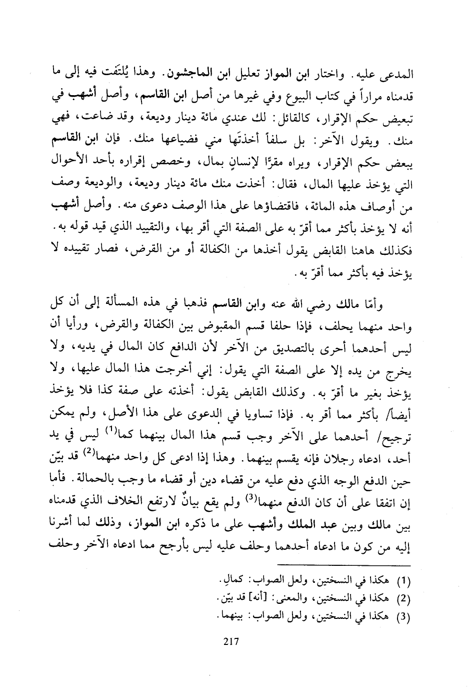 وأمّا مالك رضي الله عنه وابن القاسم فذهبا في هذه المسألة إلى أن كل واحد منهما يحلف، فإذا حلفا قسم المقبوض بين الكفالة والقرض، ورأيا أن ليس أحدهما أحرى بالتصديق من الآخر لأن الدافع كان المال في يديه، ولا يخرج من يده إلا على الصفة التي يقول: إني أخرجت هذا المال عليها, ولا يؤخذ بغير ما أقرّ به. وكذلك القابض يقول: أخذته على صفة كذا فلا يؤخذ أيضًا بأكثر مما أقر به. فإذا تساويا في ابدعوى على هذا الأصل، ولم يمكن ترجيح أحدهما على الآخر وجب قسم هذا المال بينهما كما (¬1) ليس في يد أحد، ادعاه رجلان فإنه يقسم بينهما. وهذا إذا ادعى كل واحد منهما (¬2) قد بيّن حين الدفع الوجه الذي دفع عليه من قضاء دين أو قضاء ما وجب بالحمالة. فأما إن اتفقا على أن كان الدفع منهما (¬3) ولم يقع بيان لارتفع الخلاف الذي قدمناه بين مالك وبين عبد الملك وأشهب على ما ذكره ابن المواز، وذلك لما أشرنا إليه من كون ما ادعاه أحدهما وحلف عليه ليس بأرجح مما ادعاه الآخر وحلف