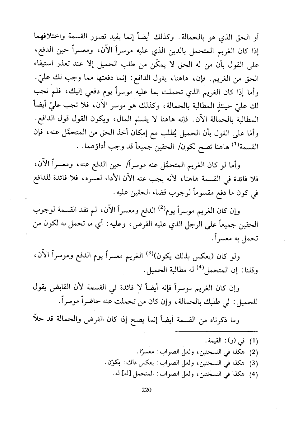 أو الحق الذي هو بالحمالة. وكذلك أيضًا إنما يفيد تصور القسمة واختلافهما إذا كان الغريم المتحمل بالدين الذي عليه موسرًا الآن، ومعسرًا حين الدفع، على القول بأن من له الحق لا يمكّن من طلب الحميل إلا عند تعذر استيفاء الحق من الغريم. فإن، ها هنا، يقول الدافع: إنما دفعتها مما وجب لك عليّ.