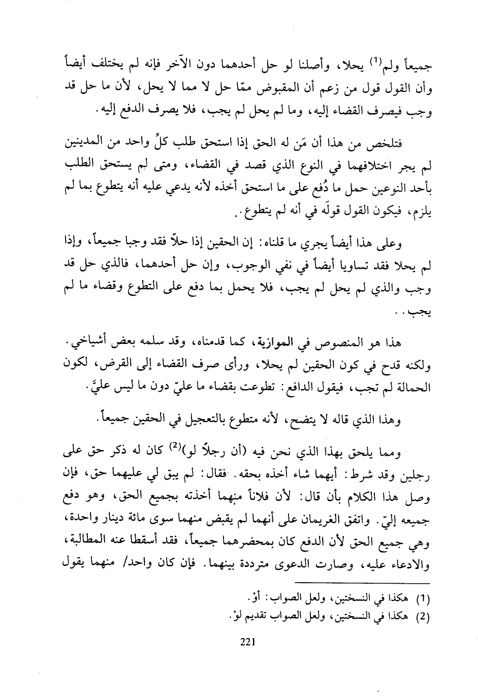 وعلى هذا أيضًا يجري ما قلناه: إن الحقين إذا حلاّ فقد وجبا جميعًا، وإذا لم يحلا فقد تساويا أيضًا في نفي الوجوب، وإن حل أحدهما، فالذي حل قد وجب والذي لم يحل لم يجب، فلا يحمل بما دفع على التطوع وقضاء ما لم يجب.