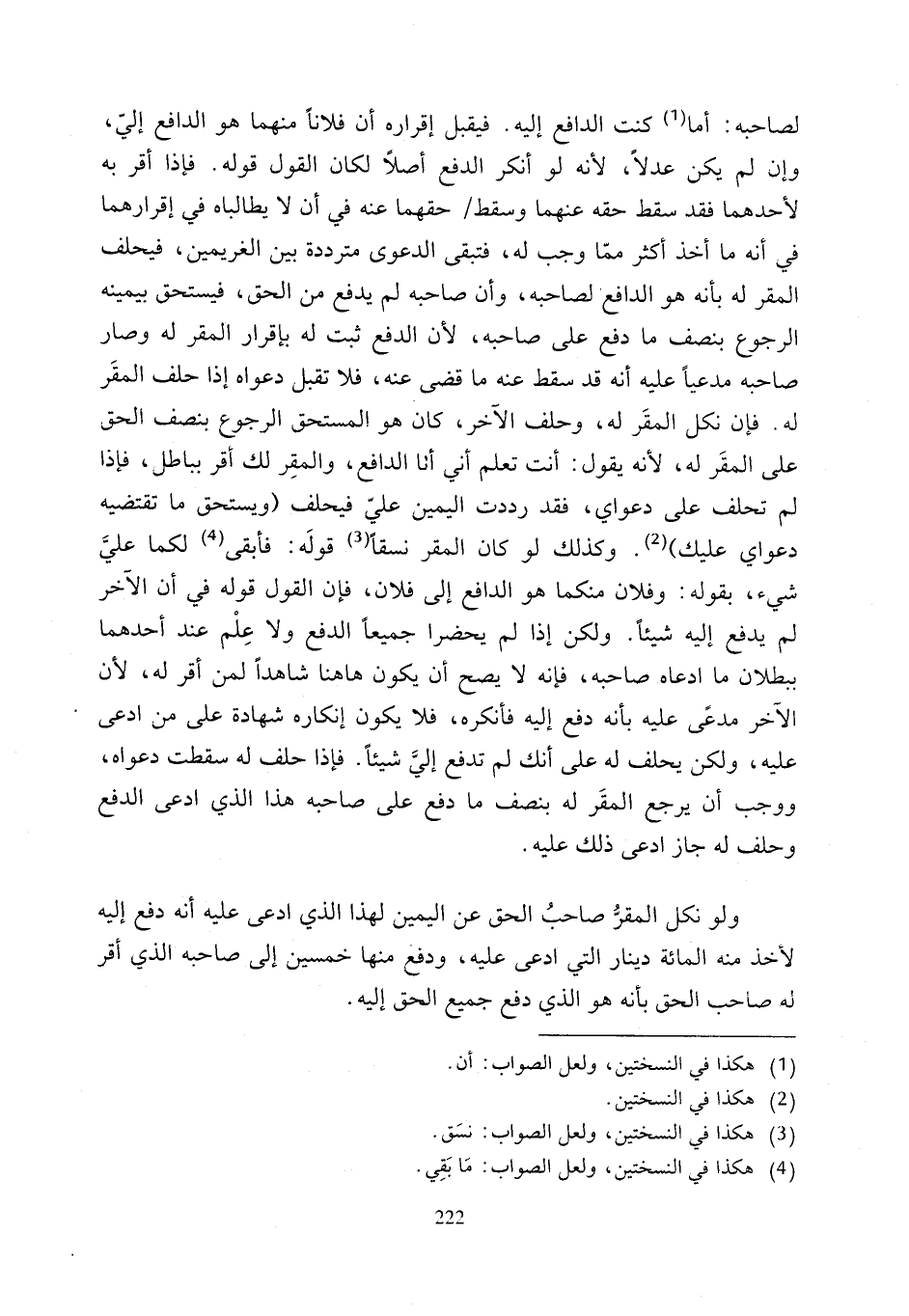 ولو نكل المقرُّ صاحبُ الحق عن اليمين لهذا الذي ادعى عليه أنه دفع إليه لأخذ منه المائة دينار التي ادعى عليه، ودفر منها خمسين إلى صاحبه الذي أقر له صاحب الحق بأنه هو الذي دفع جميع الحق إليه.