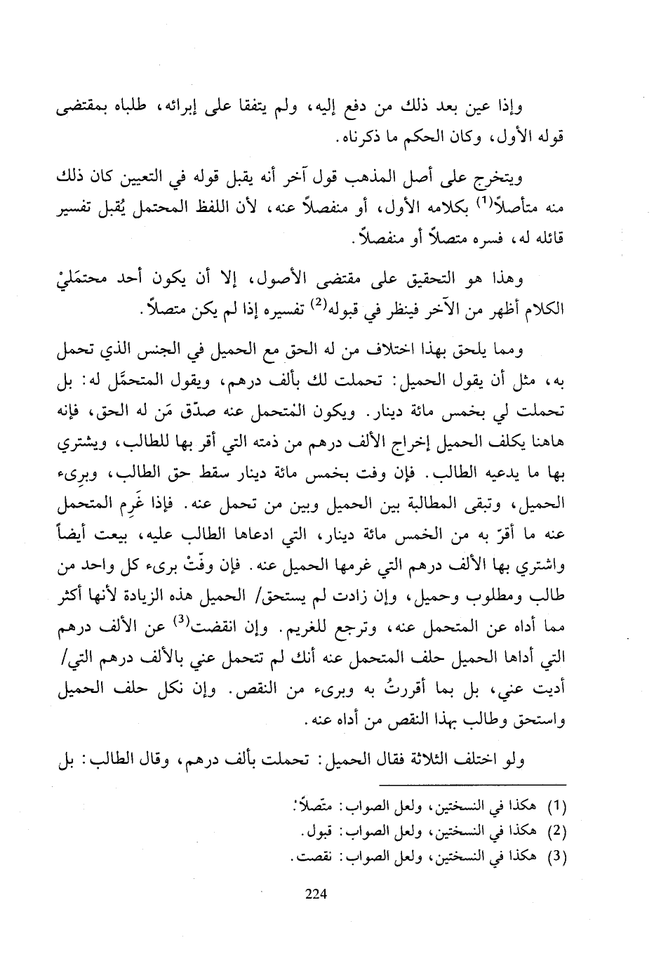 ومما يلحق بهذا اختلاف من له الحق مع الحميل في الجنس الذي تحمل به، مثل أن يقول الحميل: تحملت لك بألف درهم، ويقول المتحمَّل له: بل تحملت لي بخمس مائة دينار. ويكون الفتحمل عنه صدّق مَن له الحق، فإنه ها هنا يكلف الحميل إخراج الألف درهم من ذمته التي أقر بها للطالب، ويشتري بها ما يدعيه الطالب. فإن وفت بخمس مائة دينار سقط حق الطالب، وبرِىء الحميل، وتبقى المطالبة بين الحميل وبين من تحمل عنه. فإذا غَرِم المتحمل عنه ما أقرّ به من الخمس مائة دينار، التي ادعاها الطالب عليه، بيعت أيضًا واشتري بها الألف درهم التي غرمها الحميل عنه. فإن وفّتْ برىء كل واحد من طالب ومطلوب وحميل، وإن زادت لم يستحق الحميل هذه الزيادة لأنها أكثر مما أداه عن المتحمل عنه، وترجع للغريم. وإن انقضت (¬3) عن الألف درهم التي أداها الحميل حلف المتحمل عنه أنك لم تتحمل عني بالألف درهم التي أديت عني، بل بما أقررتُ به وبرىء من النقص. وإن نكل حلف الحميل واستحق وطالب بهذا النقص من أداه عنه.