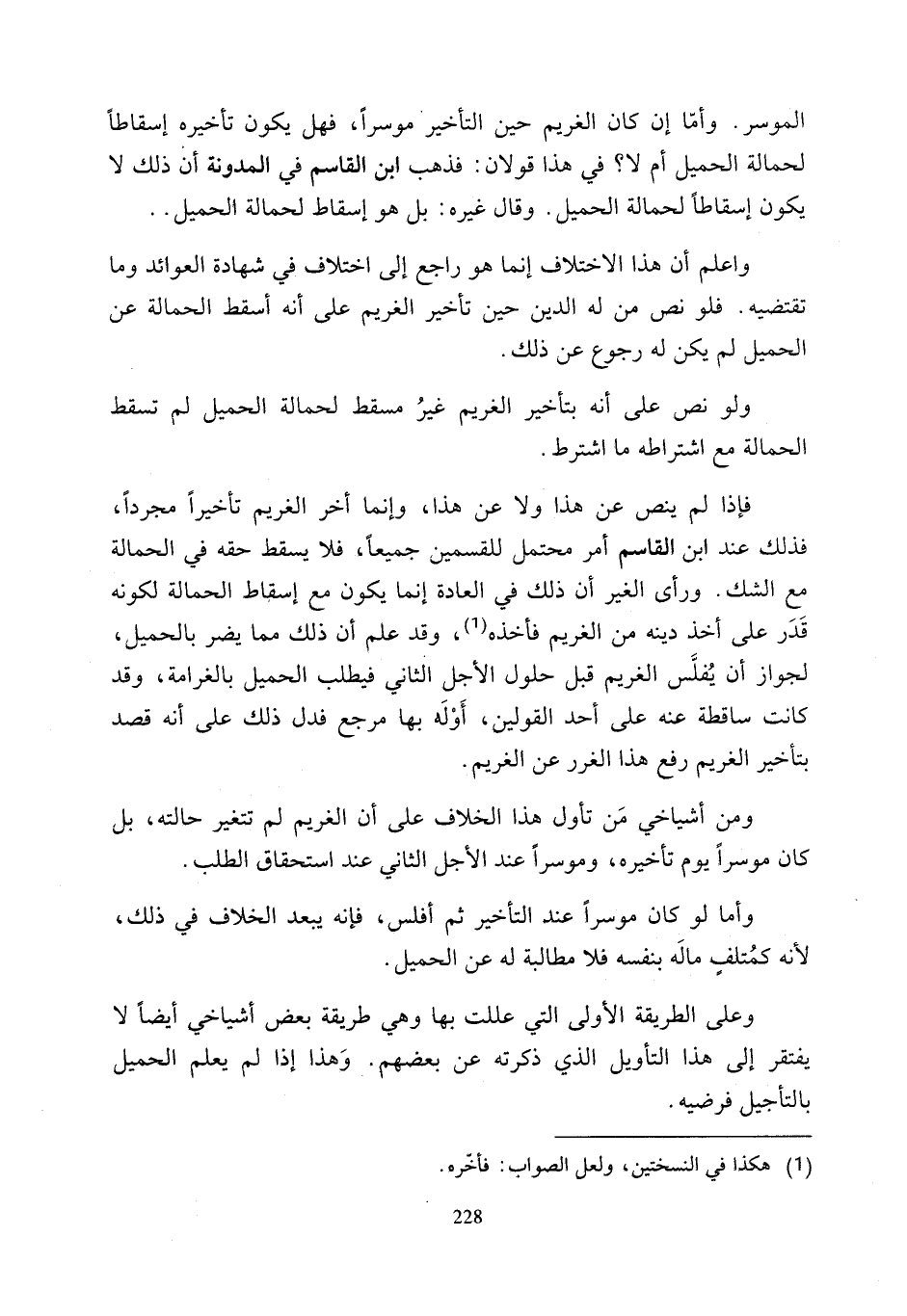 الموسر. وأمّا إن كان الغريم حين التأخير موسرًا، فهل يكون تأخيره إسقاطًا لحمالة الحميل أم لا؟ في هذا قولان: فذهب اين القاسم في المدونة أن ذلك لا يكون إسقاطًا لحمالة الحميل. وقال غيره: بل هو إسقاط لحمالة الحميل ..