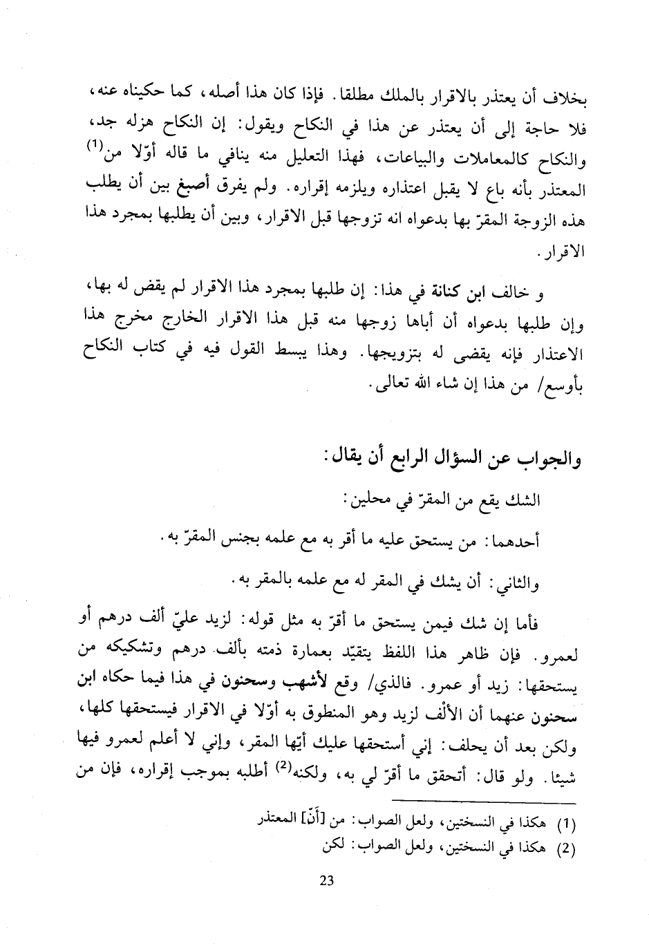بخلاف أن يعتذر بالاقرار بالملك مطلقا. فإذا كان هذا أصله، كما حكيناه عنه، فلا حاجة إلى أن يعتذر عن هذا في النكاح ويقول: إن النكاح هزله جد، والنكاح كالمعاملات والبياعات، فهذا التعليل منه ينافي ما قاله أوّلا من (¬1) المعتذر بأنه باع لا يقبل اعتذاره ويلزمه إقراره. ولم يفرق أصبغ بين أن يطلب هذه الزوجة المقر بها بدعواه انه تزوجها قبل الإقرار، وبين أن يطلبها بمجرد هذا الإقرار.