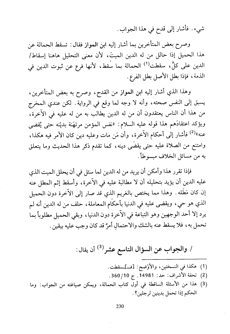 (¬3) هذا من الأسئلة الساقطة في أول كتاب الحمالة، ويمكن صياغته من الجواب: وما الحكم إذا تحمل بدينين لرجلين؟.