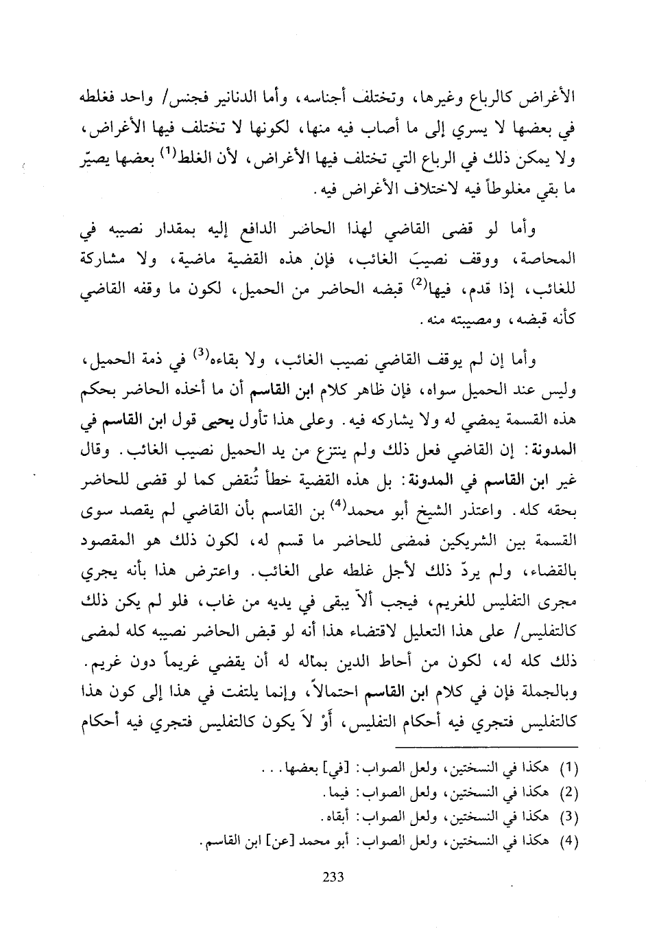 وأما إن لم يوقف القاضي نصيب الغائب، ولا بقاءه (¬3) في ذمة الحميل، وليس عند الحميل سواه، فإن ظاهر كلام ابن القاسم أن ما أخذه الحاضر بحكم هذه القسمة يمضي له ولا يشاركه فيه. وعلى هذا تأول يحيى قول ابن القاسم في المدونة: إن القاضي فعل ذلك ولم ينتزع من يد الحميل نصيب الغائب. وقال غير ابن القاسم في المدونة: بل هذه القضية خطأ تُنقض كما لو قضى للحاضر بحقه كله. واعتذر الشيخ أبو محمَّد (¬4) بن القاسم بأن القاضي لم يقصد سوى التمسمة بين الشريكين فمضى للحاضر ما قسم له، لكون ذلك هو المقصود بالقضاء، ولم يردّ ذلك لأجل غلطه على الغائب. واعترض هذا بأنه يجري مجرى التفليس للغريم، فيجب ألاّ يبقى في يديه من غاب، فلو لم يكن ذلك كالتفليس على هذا التعليل لاقتضاء هذا أنه لو قبض الحاصر نصيبه كله لمضى ذلك كله له، لكون من أحاط الدين بماله له أن يقضي غريمًا دون غريم.