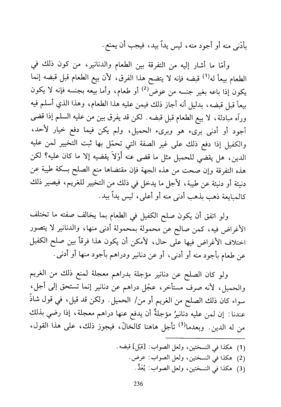 ولو اتفق أن يكون صلح الكفيل في الطعام بما يخالف صفته ما تختلف الأغراض فيه، كمن صالح عن محمولة بمحمولة أدنى منها، والدنانير لا يتصور اختلاف الأغراض فيها على حال، لأمكن أن يكون هذا فرقًا بين صلح الكفيل عن طعام بأجود منه أو أدنى، أو عن دنانير ودراهم بأجود منها أو أدنى.