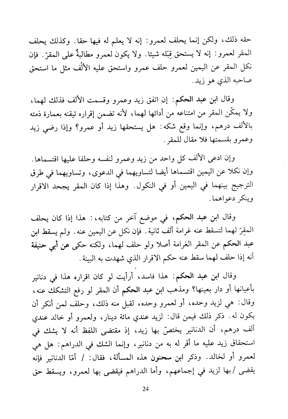 وقال ابن عبد الحكم: هذا فاسد، أرأيت لو كان اقراره هذا في دنانير بأعيانها أو دار بعينها؟ ومذهب ابن عبد الحكم أن المقر لو رفع التشكك عنه، وقال: هي لزيد وحده، أو لعمرو وحده، لقبل منه ذلك، وحلف لمن أنكر أن يكون له. ذكر ذلك فيمن قال: لزيد عندي مائة دينار، ولعمرو أو خالد عندي ألف درهم، أن الدنانير يختصّ بها زيد، إذ مقتضى اللفظ أنه لا يشك في استحقاق زيد عليه ما أقر له به من دنانير، وإنما الشك في الدراهم: هل هي لعمرو أو لخالد. وذكر ابن سحنون هذه المسألة، فقال: أمّا الدنانير فإنه يقضى بها لزيد في إجماعهم، وأما الدراهم فيقضى بها لعمرو، ويسقط حق