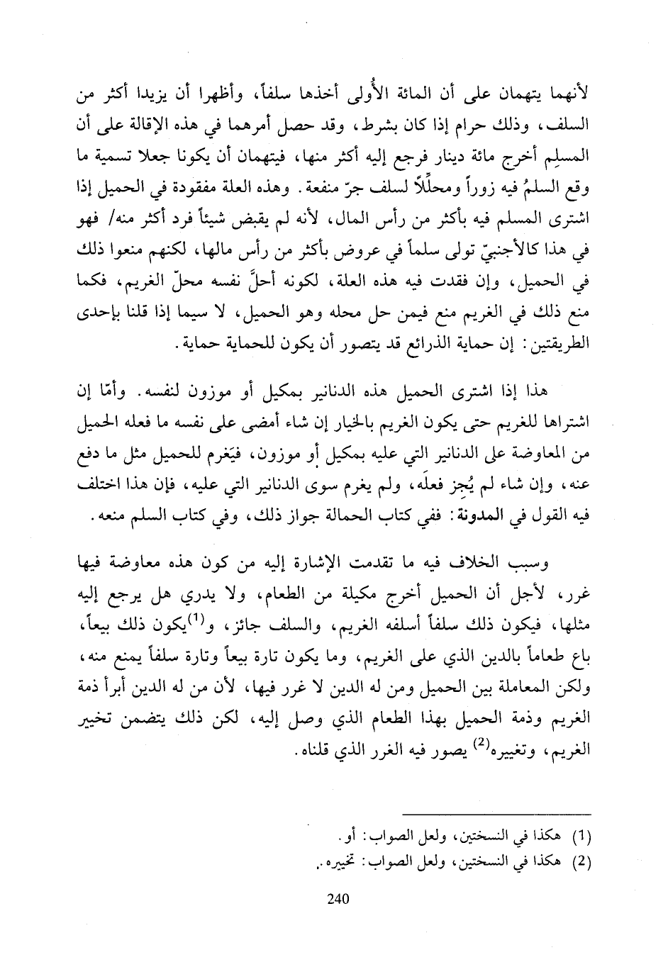 لأنهما يتهمان على أن المائة الأُولى أخذها سلفًا، وأظهرا أن يزيدا أكثر من السلف، وذلك حرام إذا كان بشرط، وقد حصل أمرهما في هذه الإقالة على أن المسلِم أخرج مائة دينار فرجع إليه أكثر منها، فيتهمان أن يكونا جعلا تسمية ما وقع السلمُ فيه زورأ ومحلِّلًا لسلف جرّ منفعة. وهذه العلة مفقودة في الحميل إذا اشترى المسلم فيه بأكثر من رأس المال, لأنه لم يقبض شيئًا فرد أكثر منه فهو في هذا كالأجنبى تولى سلمًا في عروض بأكثر من رأس مالها, لكنهم منعوا ذلك في الحميل، وإن فقدت فيه هذه العلة، لكونه أحل نفسه محلّ الغريم، فكما منع ذلك في الغريم منع فيمن حل محله وهو الحميل، لا سيما إذا قلنا بإحدى الطريقتين: إن حماية الذرائع قد يتصور أن يكون للحماية حماية.