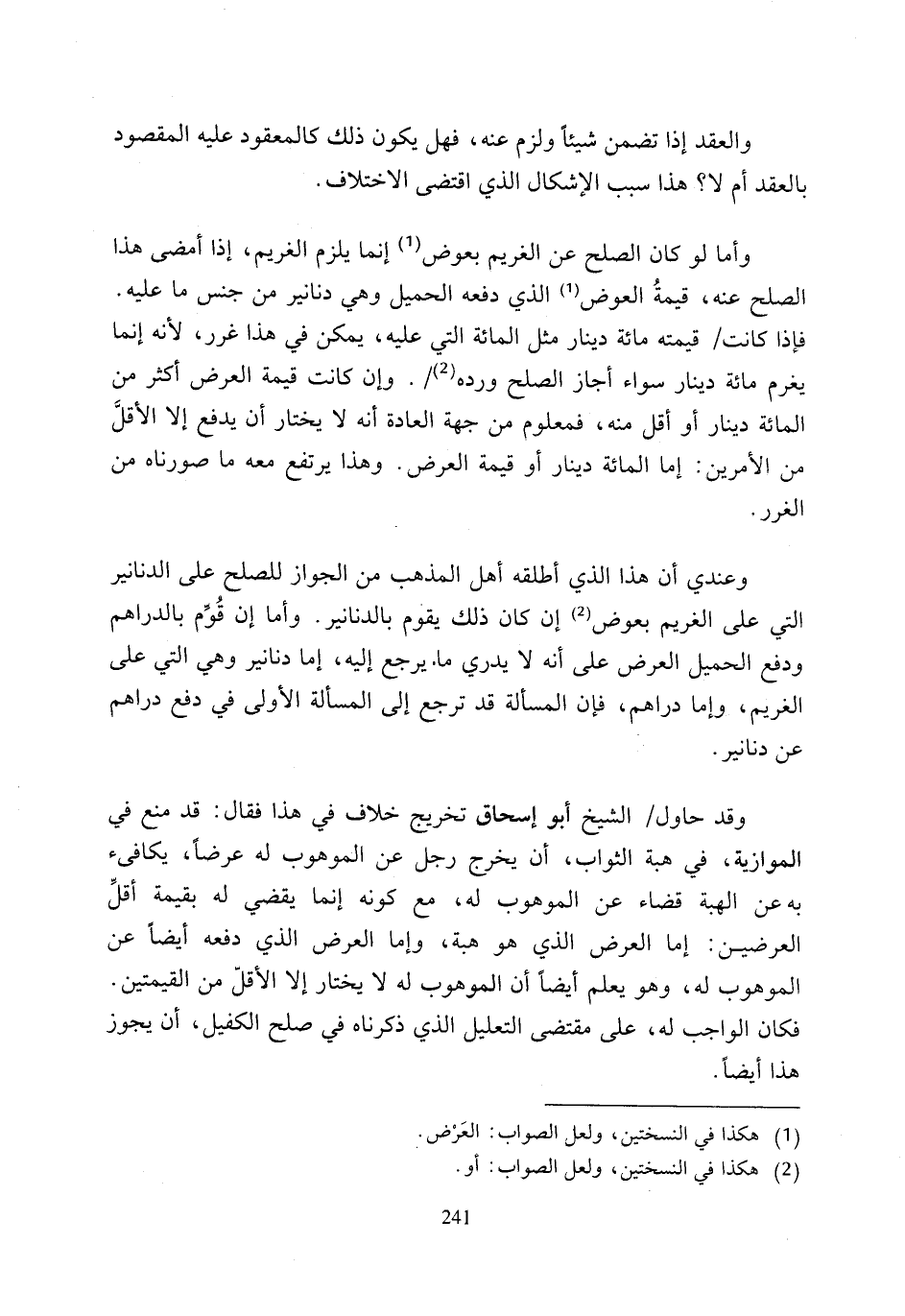 وعندي أن هذا الذي أطلقه أهل المذهب من الجواز للصلح على الدنانير التي على الغريم بعوض (2) إن كان ذلك يقوم بالدنانير. وأما إن قوِّم بالدراهم ودفع الحميل العرض على أنه لا يدري ما. يرجع إليه، إما دنانير وهي التي على الغريم، وإما دراهم، فإن المسألة قد ترجع إلى المسألة الأولى في دفع دراهم عن دنانير.