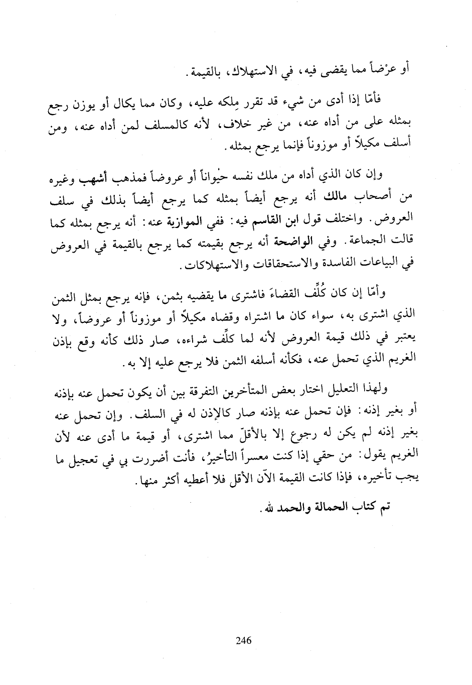 وأمّا إن كان كُلِّف القضاءَ فاشترى ما يقضيه بثمن، فإنه يرجع بمثل الثمن الذي اشترى به، سواء كان ما اشتراه وقضاه مكيلًا أو موزونًا أو عروضًا، ولا يعتبر في ذلك قيمة العروض لأنه لما كلف شراءه، صار ذلك كأنه وقع بإذن الغريم الذي تحمل عنه، فكأنه أسلفه الثمن فلا يرجع عليه إلا به.