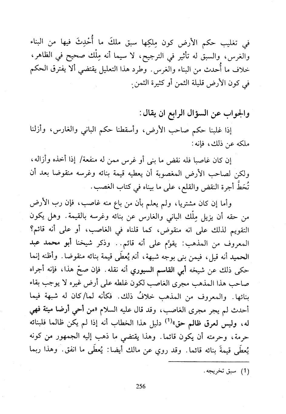 وأما إن كان مشتريا, ولم يعلم بأن من باع منه غاصب، فإن رب الأرض من حقه أن يزيل مِلْك الباني والغارس عن بنائه وغرسه بالقيمة. وهل يكون التقويم لذلك على أنه منقوض، كما قلناه في الغاصب، أو على أنه قائم؟ المعروف من المذهب: يقوَّم على أنه قائم .. وذكر شيخنا أبو محمَّد عبد الحميد أنه قيل، فيمن بني بوجه شبهة، أنبما يُعطَى قممة بنائه منقوضا. وأظنه إنما حكى ذلك عن شيخه أبي القاسم السيوري أنه نقله. فإن صحّ هذا، فإنه أجراه صاحب هذا المذهب مجرى الغاصب لكون غلطه على أرض غيره لا يوجب بقاء بنائها. والمعروف من المذهب خلافُ ذلك. فكأنه لما كان له شبهة فيما أحدث لم يجر مجرى الغاصب، وقد قال عليه السلام "من أحي أرضا ميتة فهي له، وليس لعرق ظالم حق" (¬1) دليل هذا الخطاب أنه إذا لم يكن ظالما فلبنائه حرمة، وحرمته أن يكون قائما. وهذا يقتضي ما ذهب إليه الجمهور من كونه يُعطَى قيمةَ بنائه قائما. وقد روي عن مالك أيضًا: يُعطَى ما أنفق. وهذا ربما