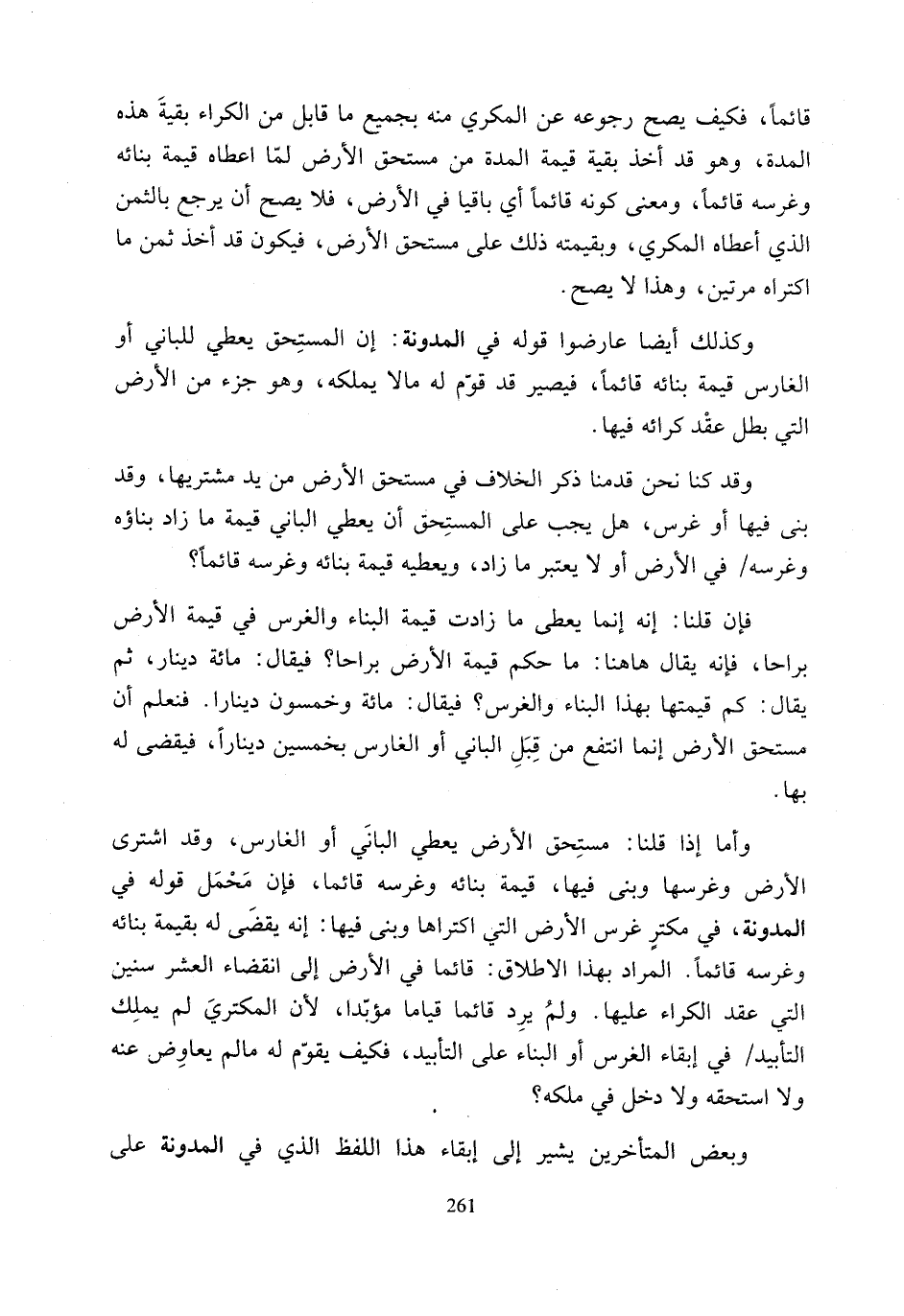 وأما إذا قلنا: مستِحق الأرض يعطي البانَي أو الغارس، وقد اشترى الأرض وغرسها وبنى فيها، قيمة بنائه وغرسه قائما، فإن مَحْمَل قوله في المدونة، في مكترٍ غرس الأرض التي اكتراها وبنى فيها: إنه يقضَى له بقيمة بنائه وغرسه قائمًا. المراد بهذا الإطلاق: قائما في الأرض إلى انقضاء العشر سنين التي عقد الكراء عليها. ولم يرِد قائما قياما مؤبّدا, لأن المكتريَ لم يملِك التأبيد في إبقاء الغرس أو البناء على التأبيد، فكيف يقوّم له ما لم يعاوِض عنه ولا إستحقه ولا دخل في ملكه؟