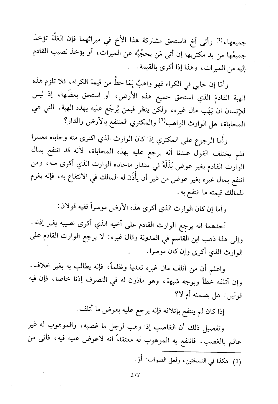 وأمّا إن حابي في الكراء فهو واهبٌ لمَا حطَّ من قيمة الكراء، فلا تلزم هذه الهبة القادمَ الذي إستحق جميع هذه الأرض، أو استحق بعضَها، إذ ليس للإنسان ان يَهَب مال غيره، ولكن ينظر فيمن يُرجَع عليه بهذه الهبة، الثي هي المحاباة، هل الوارث الواهب (1) والمكتري المنتفع بالأرض والدار؟
