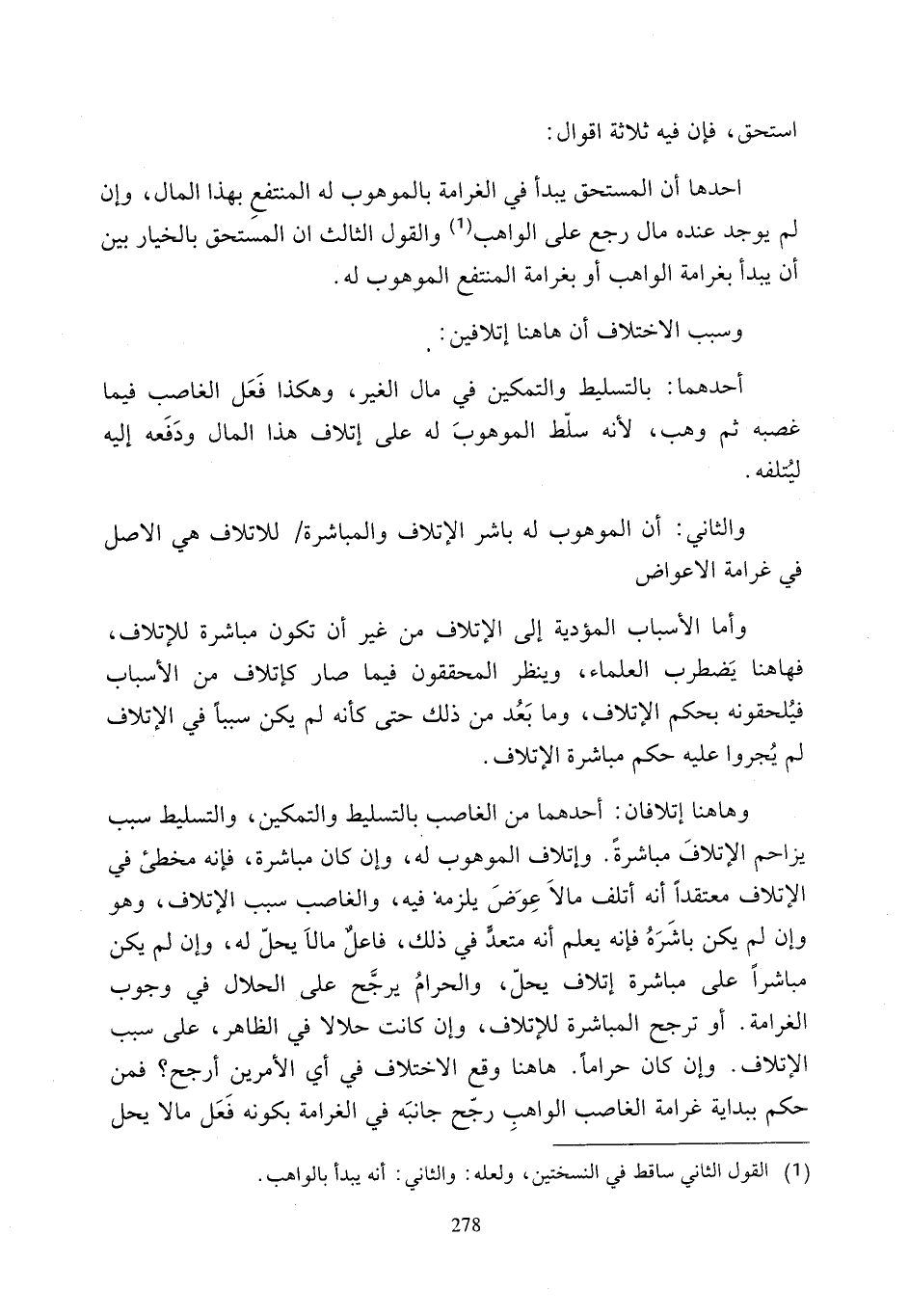 وهاهنا إتلافان: أحدهما من الغاصب بالتسليط والتمكين، والتسليط سبب يزاحم الإتلافَ مباشرةً. وإتلاف الموهوب له، وإن كان مباشرة، فإنه مخطى في الإتلاف معتقدًا أنه أتلف مالًا عِوَضَ يلزمهْ فيه، والغاصب سبب الإتلاف، وهو وإن لم يكن باشَرَهُ فإنه يعلم أنه متعدٍّ في ذلك، فاعلٌ مالاَ يحلّ له، وإن لم يكن مباشرًا على مباشرة إتلاف يحلّ، والحرامُ يرجَّح على الحل الذي وجوب الغرامة. أو ترجح المباشرة للإتلاف، وإن كانت حلالًا في الظاهر، على سبب الإتلاف. وإن كان حرامًا. ها هنا وقع الاختلاف في أي الأمرين أرجح؟ فمن حكم ببداية غرامة الغاصب الواهبِ رتجح جانبَه في الغرامة بكونه فَعَل مالًا يحل