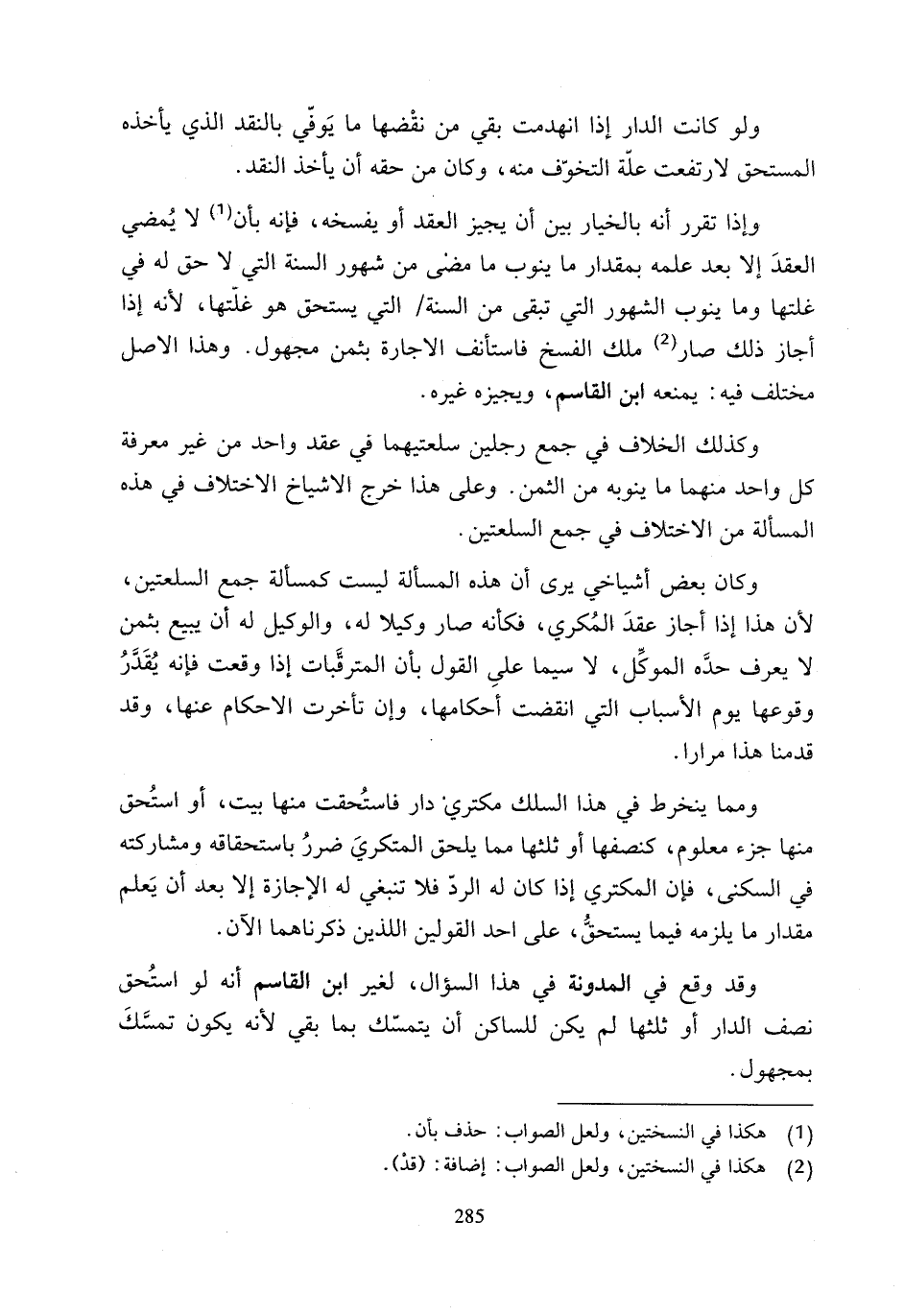وكذلك الخلاف في جمع رجلين سلعتيهما في عقد واحد من غير معرفة كل واحد منهما ما ينوبه من الثمن. وعلى هذا خرج الاشياخ الاختلاف في هذه المسألة من إلاختلاف في جمع السلعتين.