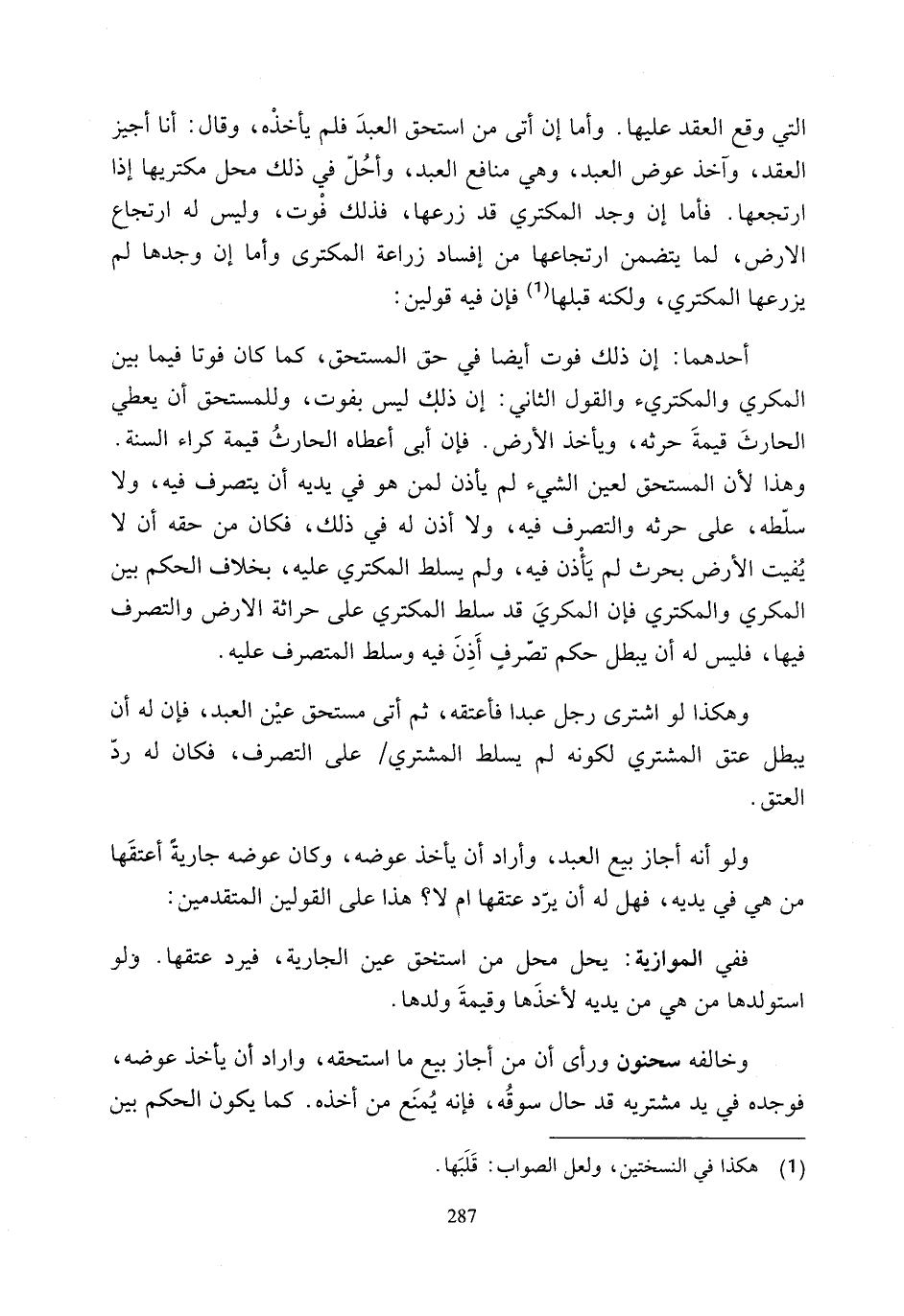 التي وقع العقد عليها. وأما إن أتى من استحق العبدَ فلم يأخذْه، وقال: أنا أجيز العقد، وآخذ عوض العبد، وهي منافع العبد، وأحُلّ في ذلك محك مكتريها إذا ارتجعها. فأما إن وجد المكتري قد زرعها، فذلك فوت، وليس له ارتجاع الأرض، لما يتضمن ارتجاعها من إفساد زراعة المكترى وأما إن وجدها لم يزرعها المكترى، ولكنه قبلها (¬1) فإن فيه قولين: