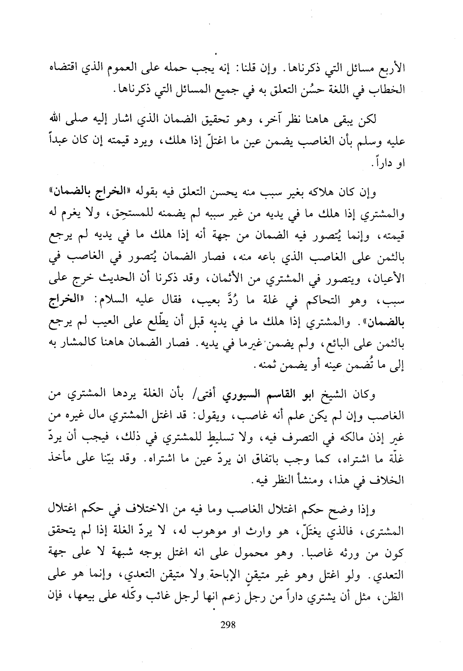 وإن كان هلاكه بغير سبب منه يحسن التعلق فيه بقوله "الخراج بالضمان" والمشترىِ إذا هلك ما في يديه من غير سببه لم يضمنه للمستحِق، ولا يغرم له قيمته، وإنما يُتصور فيه الضمان من جهة أنه إذا هلك ما في يديه لم يرجع بالثمن على الغاصب الذي باعه منه، فصار الضمان يُتصور في الغاصب في الأعيان، ويتصور في المشتري من الأثمان، وقد ذكرنا أن الحديث خرج على سبب، وهو التحاكم في غلة ما رُدَّ بعيب، فقال عليه السلام: "الخراج بالضمان". والمشتري إذا هلك ما في يديه قبل أن يطلع على العيب لم يرجع بالثمن على البائع، ولم يضمن غير ما في يديه. فصار الضمان ها هنا كالمشار به إلى ما تُضمن عينه أو يضمن ثمنه.