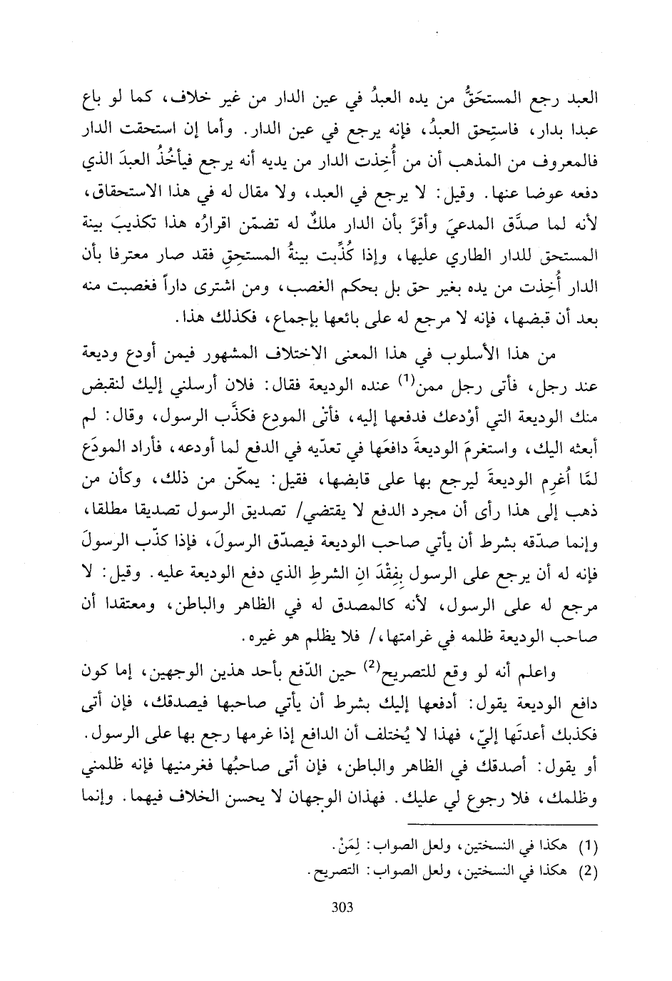 من هذا الأسلوب في هذا المعنى الاختلاف المشهور فيمن أودع وديعة عند رجل، فأتى رجل ممن (¬1) عنده الوديعة فقال: فلان أرسلني إليك لنقبض منك الوديعة التي أوْدعك فدفعها إليه، فأتى المودِع فكذَّب الرسول، وقال: لم أبعثه إليك، واستغرمَ الوديعةَ دافعَها في تعدّيه في الدفع لما أودعه، فأراد المودَع لمَّا أُغرِم الوديعةَ ليرجع بها على قايضها، فقيل: يمكّن من ذلك، وكأن من ذهب إلى هذا رأى أن مجرد الدفع لا يقتضي تصديق الرسول تصديقا مطلقا، وإنما صدّقه بشرط أن يأتي صاحب الوديعة فيصدّق الرسولَ، فإذا كذّب الرسولَ فإنه له أن يرجع على الرسول بِفِقْدَ انِ الشرطِ الذي دفع الوديعة عليه. وقيل: لا مرجع له على الرسول, لأنه كالمصدق له في الظاهر والباطن، ومعتقدا أن صاحب الوديعة ظلمه في غرامتها، فلا يظلم هو غيره.