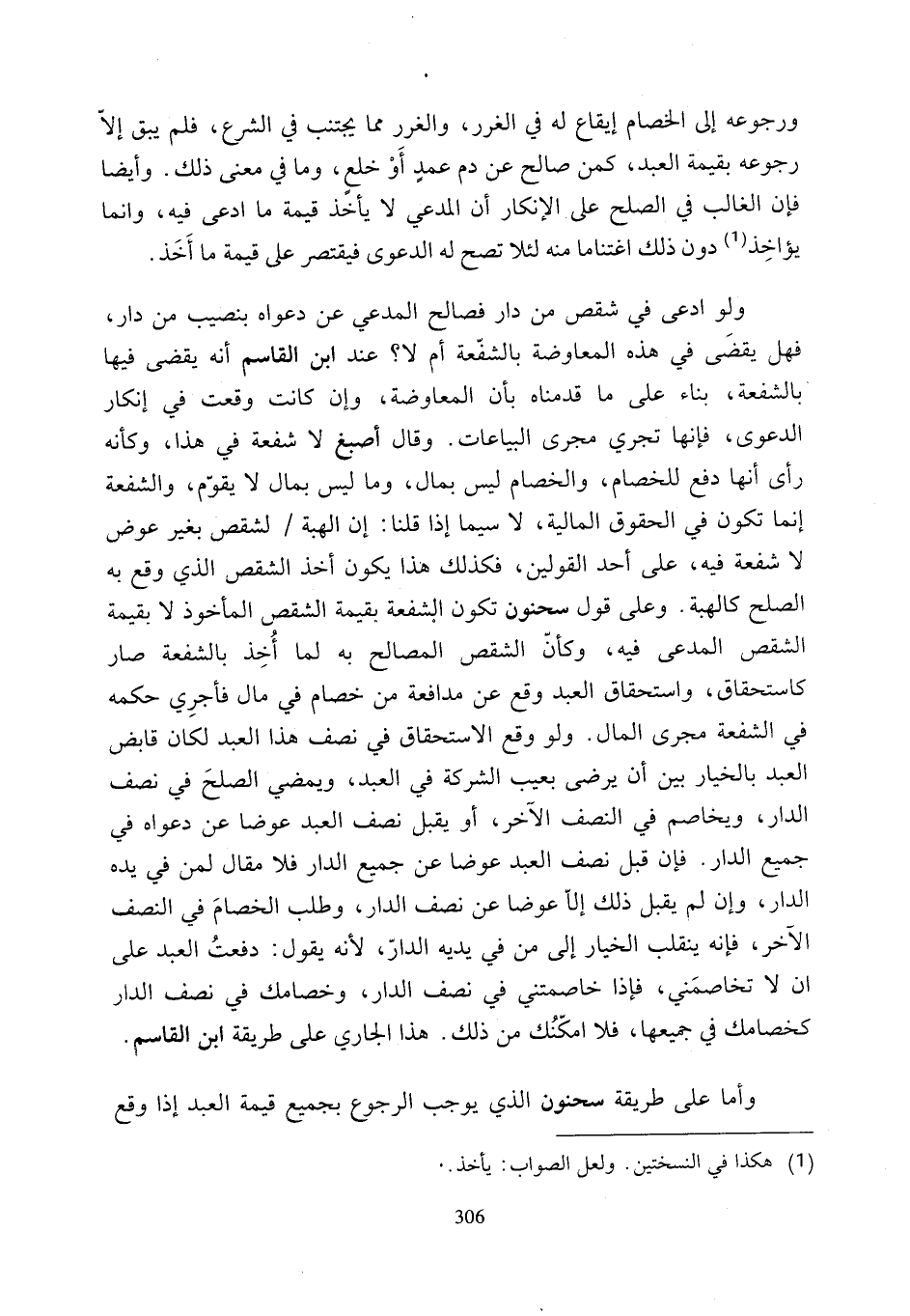 ولو ادعى في شقصِ من دار فصالح المدعي عن دعواه بنصيب من دار، فهل يقضَى في هذه المعاوضة بالشفّعة أم لا؟ عند ابن القاسم أنه يقضى فيها بالشفعة، بناء على ما قدمناه بأن المعاوضة، وإن كانت وقعت في إنكار الدعوى، فإنها تجري مجرى البياعات. وقال أصبغ لا شفعة في هذا، وكأنه رأى أنها دفع للخصام، والخصام ليس بمال، وما ليس بمال لا يقوّم، والشفعة إنما تكون في الحقوق المالية، لا سيما إذا قلنا: إن الهبة لشقص بغير عوض لا شفعة فيه، على أحد القولين، فكذلك فذا يكون أخذ الشقص الذي وقع به الصلح كالهبة. وعلى قول سحنون تكون الشفعة بقيمة الشقص المأخوذ لا يقيمة الشقص المدعى فيه، وكأنّ الشقص المصالح به لما أُخِذ بالشفعة صار كاستحقاق، واستحقاق العبد وقع عن مدافعة من خصام في مال فأجرِي حكمه في الشفعة مجرى المال. ولو وقع الاستحقاق في نصف هذا العبد لكان قابض العبد بالخيار بين أن يرضى بعيب الشركة في العبد، ويمضي الصلحَ في نصف الدار، ويخاصم في النصف الآخر، أو يقبل نصف العبد عوضا عن دعواه في جميع الدار. فإن قبل نصف العبد عوضا عن جميع الدار فلا مقال لمن في يده الدار، وإن لم يقبل ذلك إلاّ عوضا عن نصف الدار، وطلب الخصامَ في النصف الآخر، فإنه ينقلب الخيار إلى من في يديه الدارّ, لأنه يقول: دفعتُ العبد على ان لا تخاصمَني، فإذا خاصمتني في نصف الدار، وخصامك في نصف الدار كخصامك في جميعها، فلا امكّنُك من ذلك. هذا البخاري على طريقة ابن القاسم.