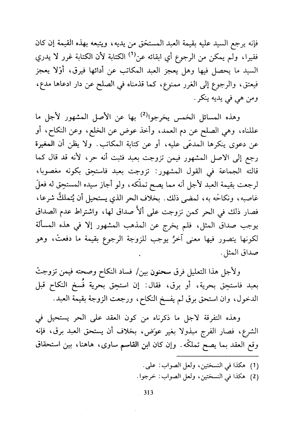 ولأجل هذا التعليل فرق سحنون بين فساد النكاح وصحته فيمن تزوجتْ بعبد فاستحِق بحرية، أو برق، فقال: إن استحِق بحريهّ فُسخ النكاح قبل الدخول، وان استحق برق لم يفسخ النكاح، ورجعت الزوجة بقيمة العبد.