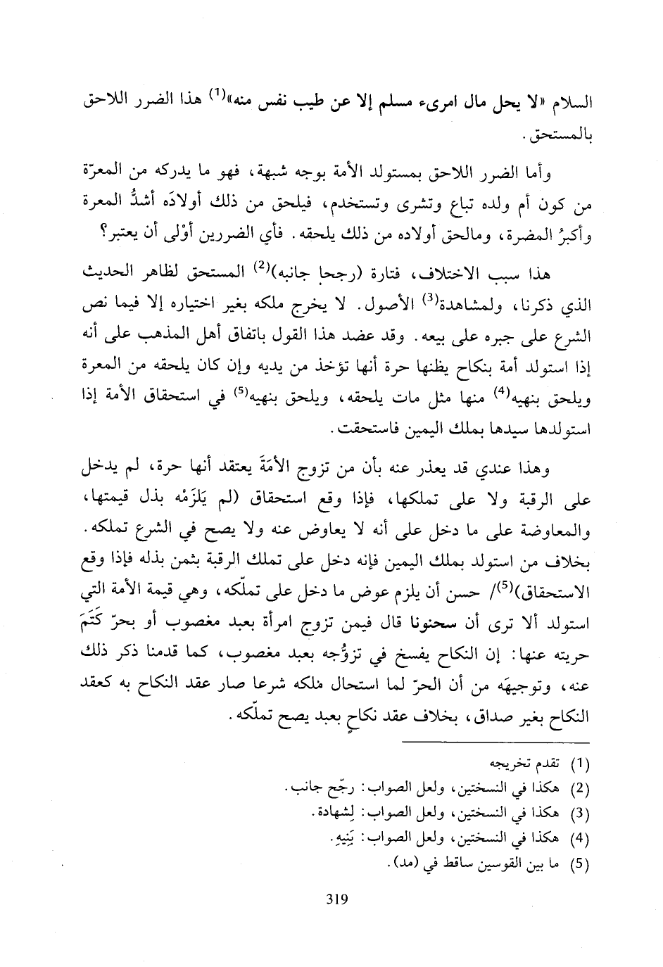بخلاف من استولد بملك اليمين فإنه دخل على تملك الرقبة بثمن بذله فإذا وقع الاستحقاق) (5) حسن أن يلزم عوض ما دخل على تملّكه، وهي قيمة الأمة التي استولد ألا ترى أن سحنونا قال فيمن تزوج امرأة بعبد مغصوب أو بحرّ كَتَمَ حريته عنها: إن النكاح يفسخ في تزوُّجه بعبد مغصوب، كما قدمنا ذكر ذلك عنه، وتوجيهَه من أن الحرّ لما استحال فلكه شرعًا صار عقد النكاح به كعقد النكاح بغير صداق، بخلاف عقد نكاحٍ بعبد يصح تملّكه.