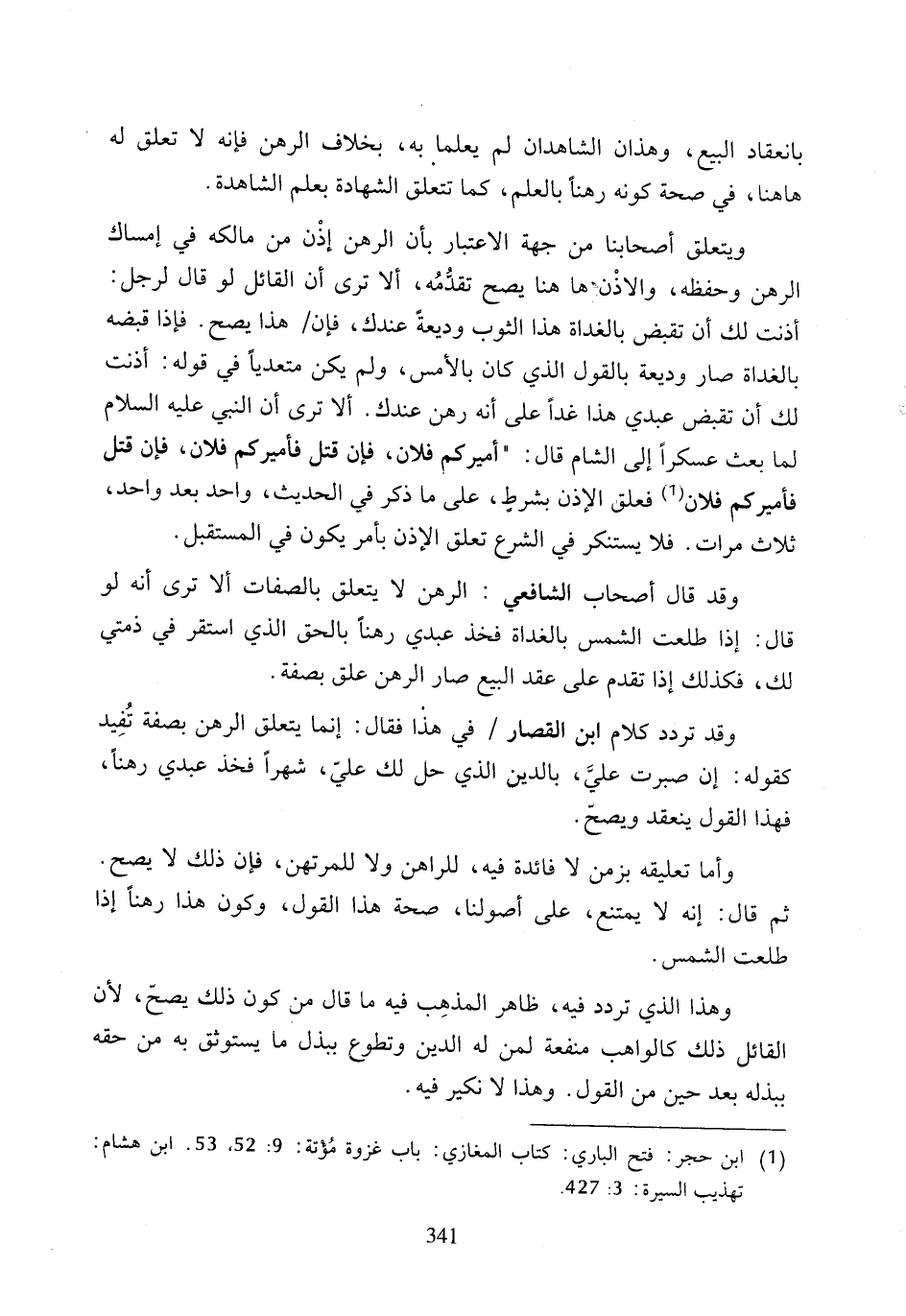 ويتعلق أصحابنا من جهة الاعتبار بأن الرهن إذْن من مالكه في إمساك الرهن وحفظه، والإذْن ها هنا يصح تقدُّمُه، ألا ترى أن القائل لو قال لرجل: أذنت لك أن تقبض بالغداة هذا الثوب وديعةً عندك، فإن هذا يصح. فإذا قبضه بالغداة صار وديعة بالقول الذي كان بالأمس، ولم يكن متعديًا في قوله: أذنت لك أن تقبض عبدي هذا غدًا على أنه رهن عندك. ألا ترى أن النبي عليه السلام لما بعث عسكرًا إلى الشام قال: "أميركم فلان، فإن قتل فأميركم فلان، فإن قتل فأميركم فلان (¬1) فعلق الإذن بشرط، على ما ذكر في الحديث، واحد بعد واحد، ثلاث مرات. فلا يستنكر في الشرع تعلق الإذن بأمر يكون في المستقبل.