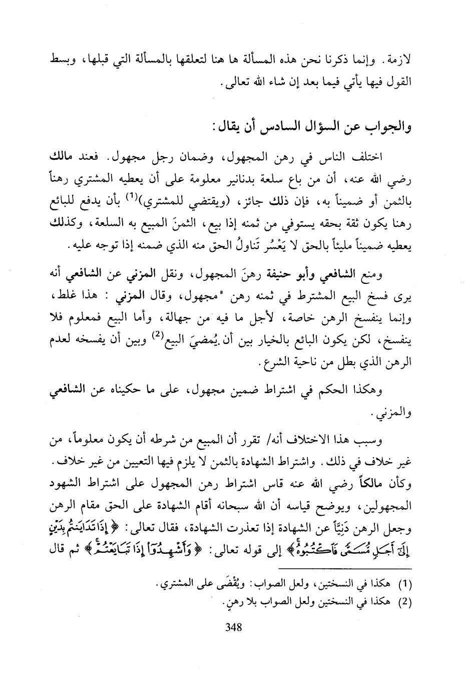 ومنع الشافعي وأبو حنيفة رهنَ المجهول، ونقل المزني عن الشافعي أنه يرى فسخ البيع المشترط في ثمنه رهن "مجهول" وقال المزني: هذا غلط، وإنما ينفسخ الرهن خاصة، لأجل ما فيه من جهالة، وأما البيع فمعلوم فلا ينفسخ، لكن يكون البائع بالخيار بين أن. يُمضيَ البيع (¬2) وبين أن يفسخه لعدم الرهن الذي بطل من ناحية الشرع.