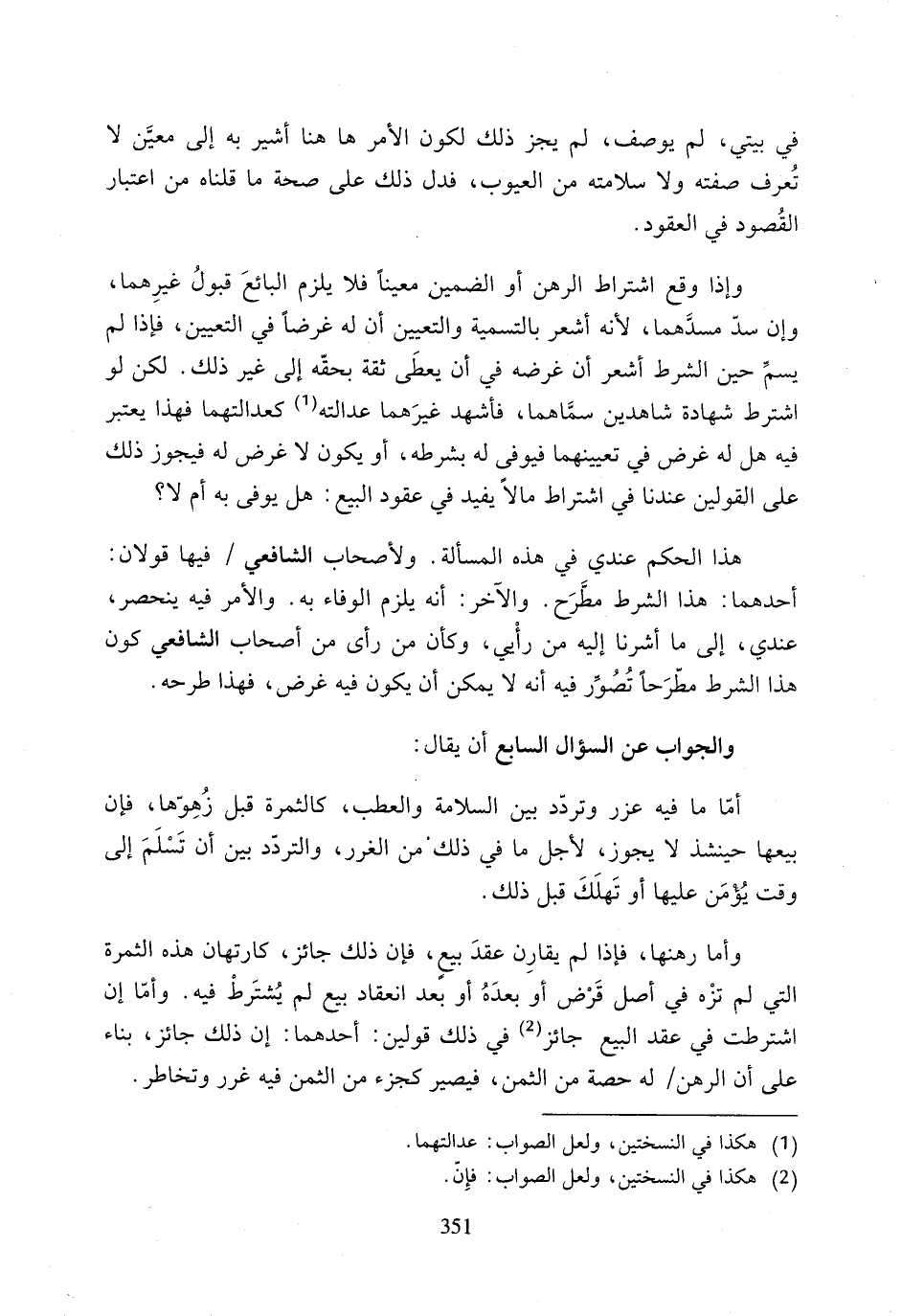 هذا الحكم عندي في هذه المسألة. ولأصحاب الشافعي فيها قولان: أحدهما: هذا الشرط مطَّرَح. والآخر: أنه يلزم الوفاء به. والأمر فيه ينحصر، عندي، إلى ما أشرنا إليه من رأْيى، وكأن من رأى من أصحاب الشافعي كون هذا الشرط مطّرَحًا تُصُوِّر فيه أنه لا يمكن أن يكون فيه غرض، فهذا طرحه.
