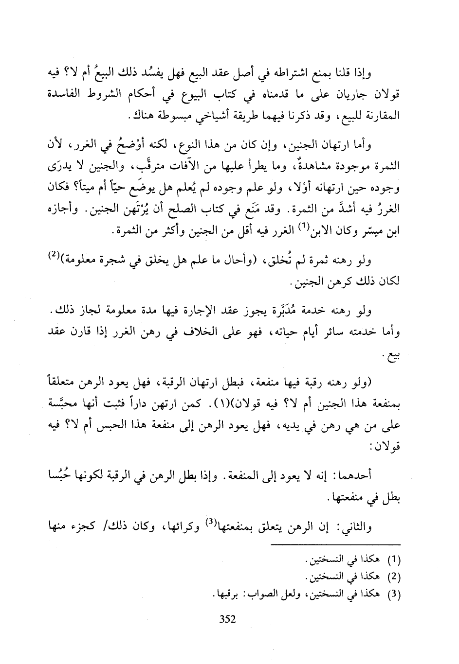 وأما ارتهان الجنين، وإن كان من هذا النوع، لكنه أوْضحُ في الغور, لأن الثمرة موجودة مشاهدةٌ، وما يطرأ عليها من الآفات مترقَّب، والجنين لا يدرَى وجوده حين ارتهانه أوْ لا, ولو علم وجوده لم يُعلم هل يوضَع حيًّا أم ميتًا؟ فكان الغورُ فيه أشدَ من الثمرة. وقد مَنَع في كتاب الصلح أن يُرْتَهن الجنين. وأجازه ابن ميسّر وكان الابن (¬1) الغرر فيه أقل من الجنين وأكثر من الثمرة.