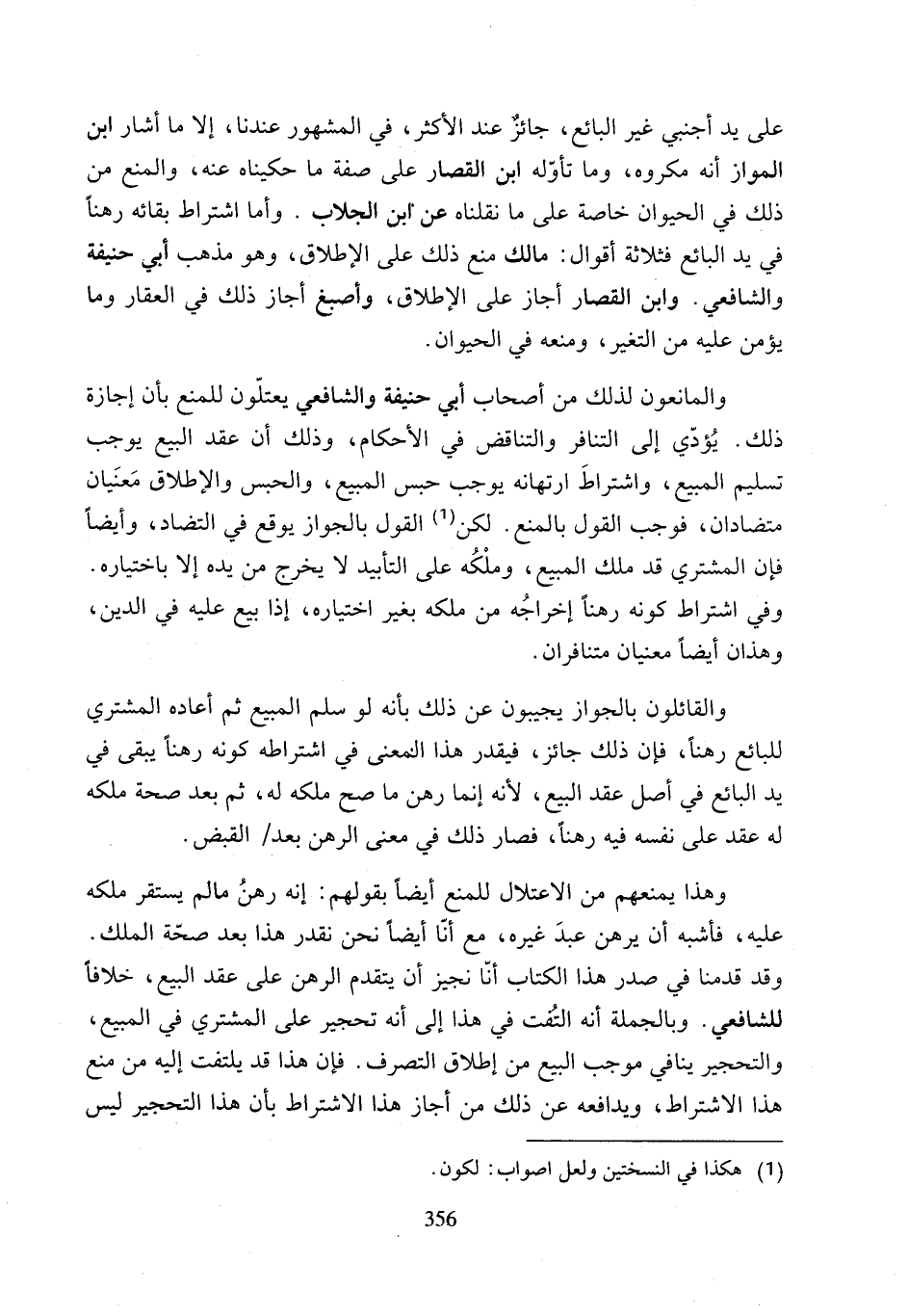 وقد قدمنا في صدر هذا الكتاب أنّا نجيز أن يتقدم الرهن على عقد البيع، خلافًا للشافعي. وبالجملة أنه التمت في هذا إلى أنه تحجير على المشتري في المبيع، والتحجير ينافي موجب البيع من إطلاق التصرف. فإن هذا قد يلتفت إليه من منع هذا الاشتراط، ويدافعه عن ذلك من أجاز هذا الاشتراط بأن هذا التحجير ليس