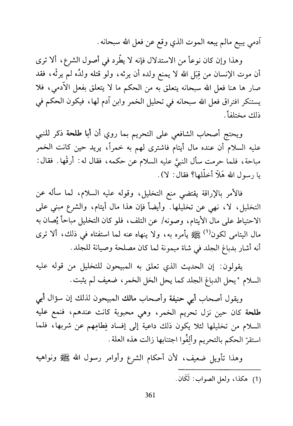 وهذا وإن كان نوعًا من الاستدلال فإنه لا يطّرد في أصول الشرع، ألا ترى أن موت الإنسان من قِبَل الله لا يمنع ولده أن يرثه، ولو قتله ولدُه لم يرثْه، فقد صار ها هنا فعل الله سبحانه يتعلق به من الحكم ما لا يتعلق بفعل الآدمي، فلا يستنكر افتراق فعل الله سبحانه في تحليل الخمر وابن آدم لها، فيكون الحكم في ذلك مختلفًا.
