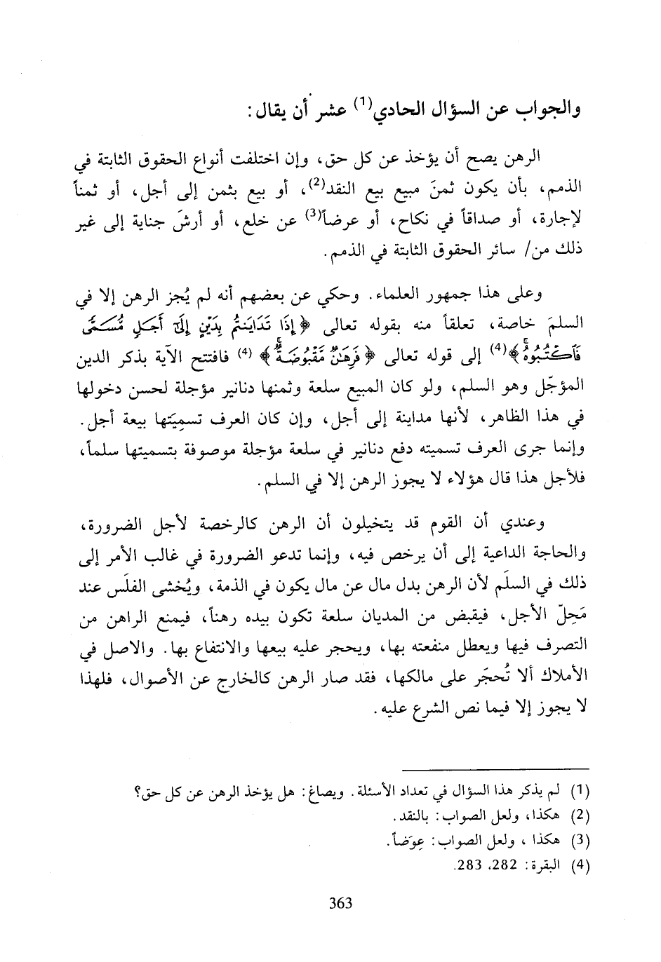 (¬1) لم يذكر هذا السؤ الذي تعداد الأسئلة. ويصاغ: هل يؤخذ الرهن عن كل حق؟