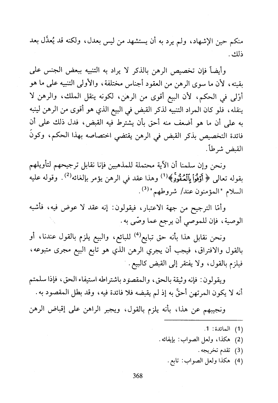 وأيضًا فإن تخصيص الرهن بالذكر لا يراد به التنبيه ببعض الجنس على بقيته, لأن ما سوى الرهن من العقود أجناس مختلفة، والأولى التنبيه على ما هو أوْلى في الحكم, لأن البيع أقوى من الرهن، لكونه ينقل الملك، والرهن لا ينقله، فلو كان المراد التنبيه لذكر القبض في البيع الذي هو أقوى من الرهن لينبه به على أن ما هو أضعف منه أحق بأن يشترط فيه القبض، فدل ذلك على أن فائدة التخصيص بذكر القبض في الرهن يقتضي اختصاصه بهذا الحكم، وكونَ القبض شرطًا ونحن وإن سلمنا أن الآية محتملة للمذهبين فإنا نقابل ترجيحهم لتأويلهم بقوله تعالى {أَوْفُوا بِالْعُقُودِ} (¬1) وهذا عقد في الرهن يؤمر بإلغائه (¬2). وقوله عليه السلام" المؤمنون عند شروطهم" (¬3).