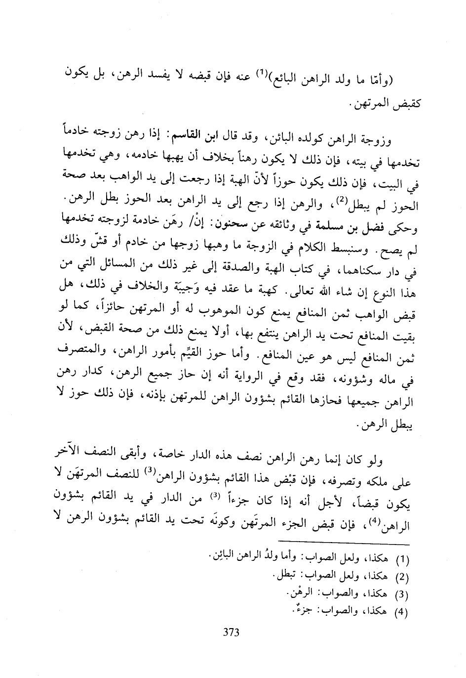 وحكى فضل بن مسلمة في وثائقه عن سحنون: إن رهَن خادمة لزوجته تخدمها لم يصح. وسنبسط الكلام في الزوجة ما وهبها زوجها من خادم أو قشّ وذلك في دار سكناهما، في كتاب الهبة والصدقة إلى غير ذلك من المسائل التي من هذا النوع إن شاء الله تعالى. كهبة ما عقد فيه وَجيبَة والخلاف في ذلك، هل قبض الواهب ثمن المنافع يمنع كون الموهوب له أو المرتهن حائزًا، كما لو بقيت المنافع تحت يد الراهن ينتفع بها، أولًا يمنع ذلك من صحة القبض, لأن ثمن المنافع ليس هو عين المنافع. وأما حوز القيَّم بأمور الراهن، والمتصرف في ماله وشؤونه، فقد وقع في الرواية أنه إن حاز جميع الرهن، كدار رهن الراهن جميعها فحازها القائم بشؤون الراهن للمرتهن بإذنه، فإن ذلك حوز لا يبطل الرهن.