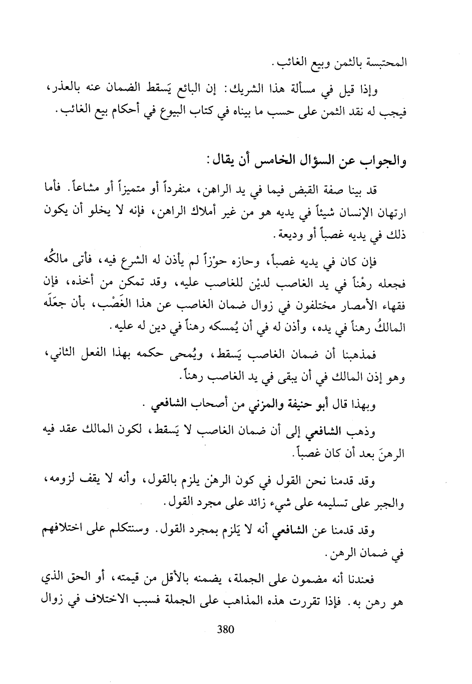 فإن كان في يديه غصبًا، وحازه حوْزًا لم يأذن له الشرع فيه، فأتى مالكُه فجعله رهْنًا في يد الغاصب لديْن للغاصب عليه، وقد تمكن من أخذه، فإن فقهاء الأمصار مختلفون في زوال ضمان الغاصب عن هذا الغَصْب، بأن جعَلَه المالكُ رهنًا في يده، وأذن له في أن يُمسكه رهنًا في دين له عليه. فمذهبنا أن ضمان الغاصب يَسقط، ويُمحى حكمه بهذا الفعل الثاني، وهو إذن المالك في أن يبقى في يد الغاصب رهنًا.