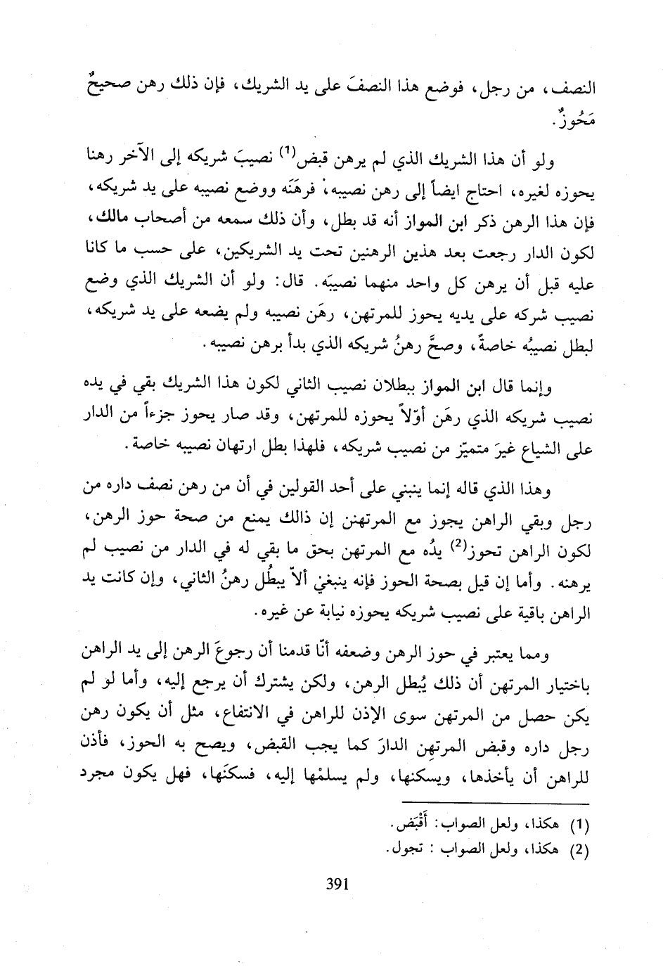 وإنما قال ابن المواز ببطلان نصيب الثاني تكون هذا الشريك بقي في يده نصيب شريكه الذي رهَن أوّلًا يحوزه للمرتهن، وقد صار يحوز جزءًا من الدار على الشياع غيرَ متميز من نصيب شريكه، فلهذا بطل ارتهان نصيبه خاصة.