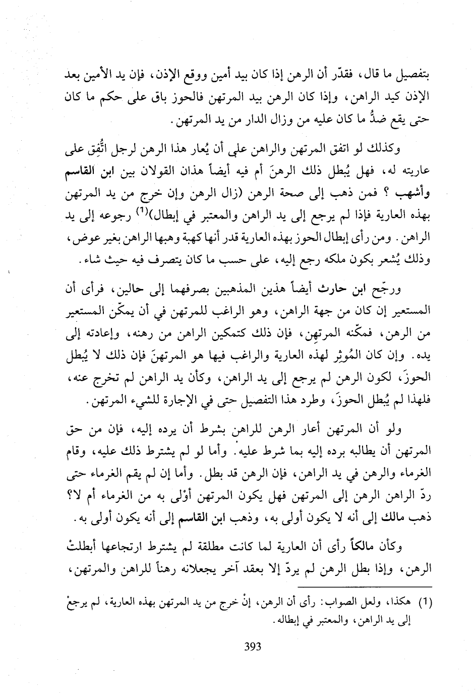 ورجّح ابن حارث أيضًا هذين المذهبين بصرفهما إلى حالين، فرأى أن المستعير إن كان من جهة الراهن، وهو الراغب للمرتهن في أن يمكّن المستعير من الرهن، فمكنه المرتهِن، فإن ذلك كتمكين الراهن من رهنه، وإعادته إلى يده. وإن كان المُوثِر لهذه العارية والراغب فيها هو المرتهنَ فإن ذلك لا يُبطل الحوزَ، تكون الرهن لم يرجع إلى يد الراهن، وكأن يد الراهن لم تخرج عنه، فلهذا لم يُبطل الحوزَ، وطرد هذا التفصيل حتى في الإجارة للشيء المرتهن.