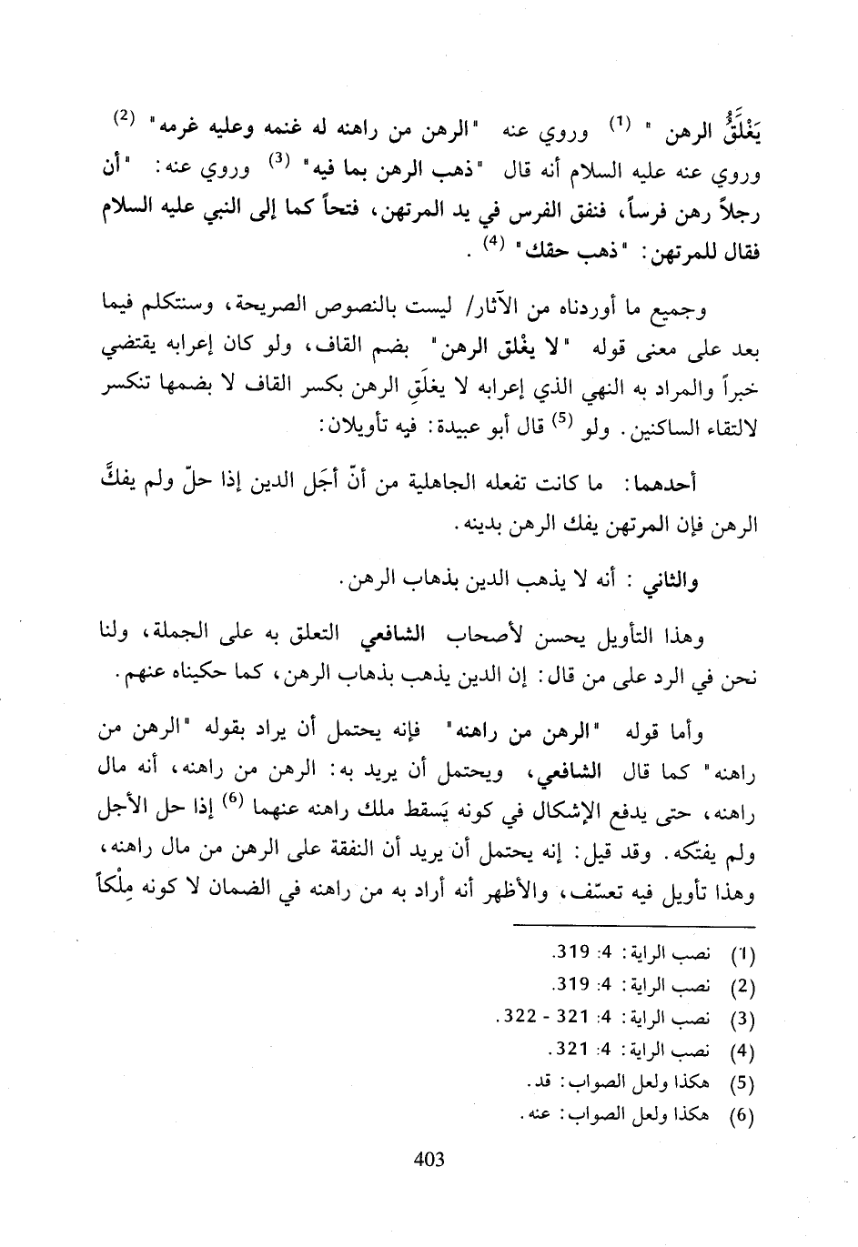 وجميع ما أوردناه من الآثار ليست بالنصوص الصريحة، وسنتكلم فيما بعد على معنى قوله "لا يغْلق الرهن" بضم القاف، ولو كان إعرابه يقتضي خبرًا والمراد به النهي الذي إعرابه لا يغلَقِ الرهن بكسر القاف لا بضمها تنكسر لالتقاء الساكنين. ولو (¬5) قال أبو عبيدة: فيه تأويلان: