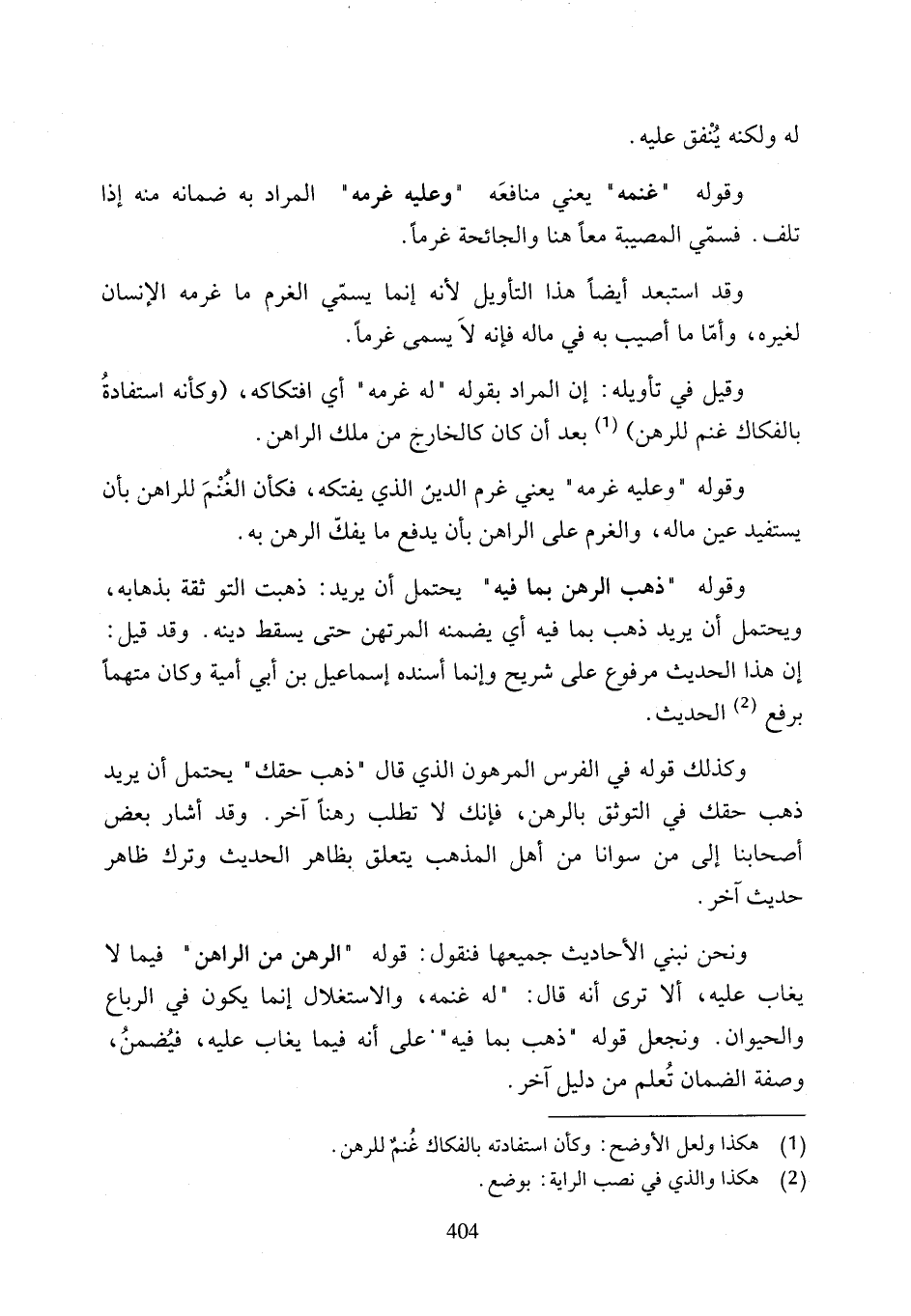 وكذلك قوله في الفرس المرهون الذي قال "ذهب حقك" يحتمل أن يريد ذهب حقك في التوثق بالرهن، فإنك لا تطلب رهنًا آخر. وقد أشار بعض أصحابنا إلى من سوانا من أهل المذهب يتعلق بظاهر الحديث وترك ظاهر حديث آخر.