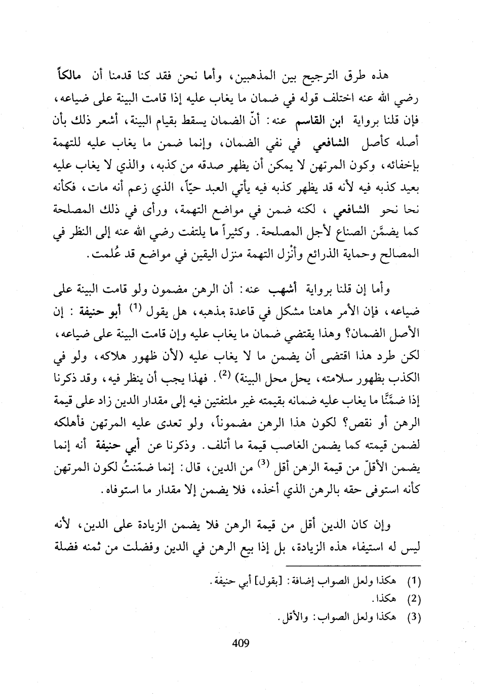 هذه طرق الترجيح بين المذهبين، وأما نحن فقد كنا قدمنا أن مالكًا رضي الله عنه اختلف قوله في ضمان ما يغاب عليه إذا قامت البينة على ضياعه، فإن قلنا برواية ابن القاسم عنه: أنّ الضمان يسقط بقيام البينهّ، أشعر ذلك بأن أصله كأصل الشافعي في نفي الضمان، وإنما ضمن ما يغاب عليه للتهمة بإخفائه، وكون المرتهن لا يمكن أن يظهر صدقه من كذبه، والذي لا يغاب عليه بعيد كذبه فيه لأنه قد يظهر كذبه فيه يأتي العبد حيًّا، الذي زعم أنه مات، فكأنه نحا نحو الشافعي، لكنه ضمن في مواضع التهمة، ورأى في ذلك المصلحة كما يضمَّن الصناع لأجل المصلحة. وكثيرًا ما يلتفت رضي أدله عنه إلى النظر في المصالح وحماية الذرائع وأنْزل التهمة منزل اليقين في مواضع قد عُلمت.